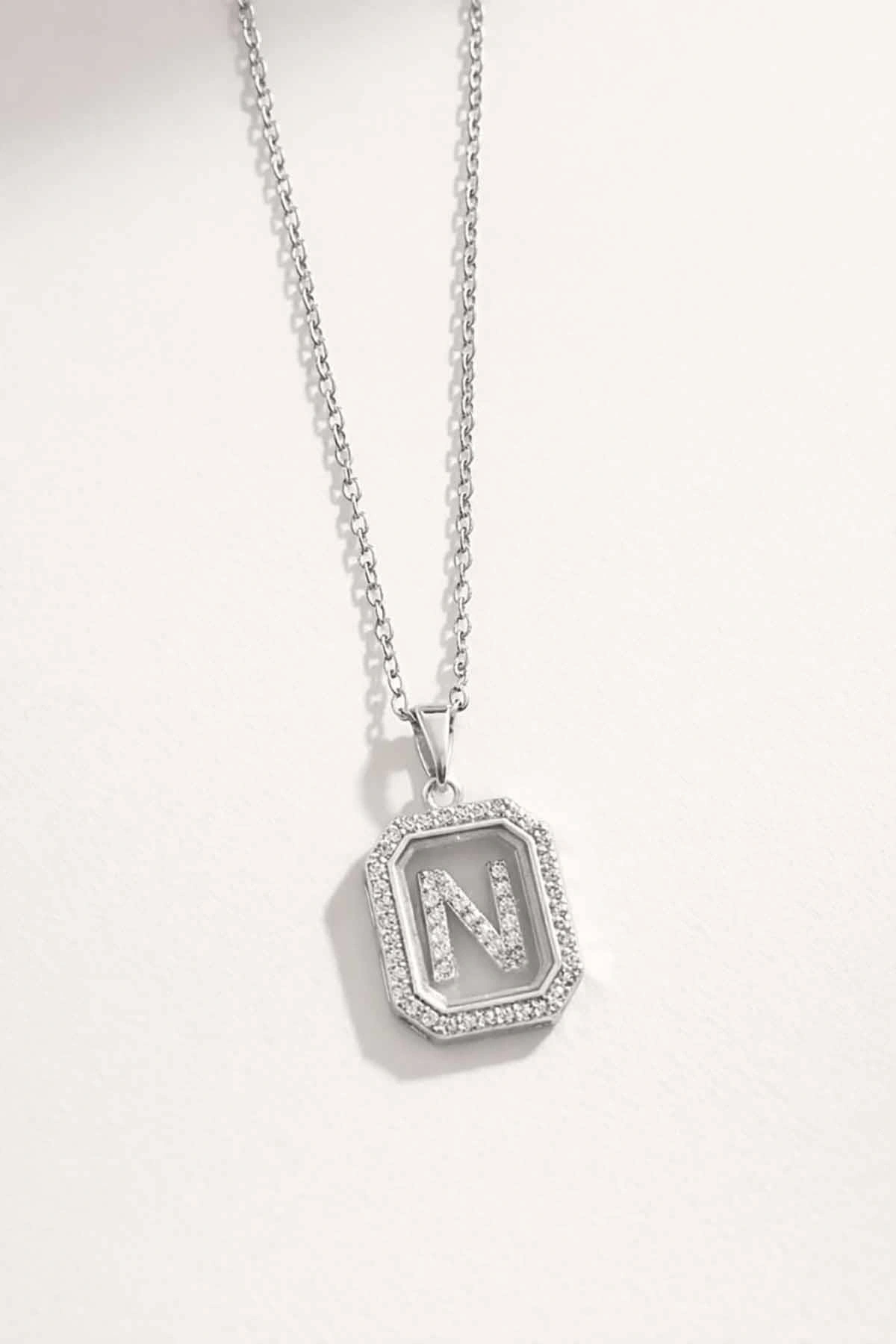 Gümüş Renk N Harf Taş Detaylı Çelik Kolye