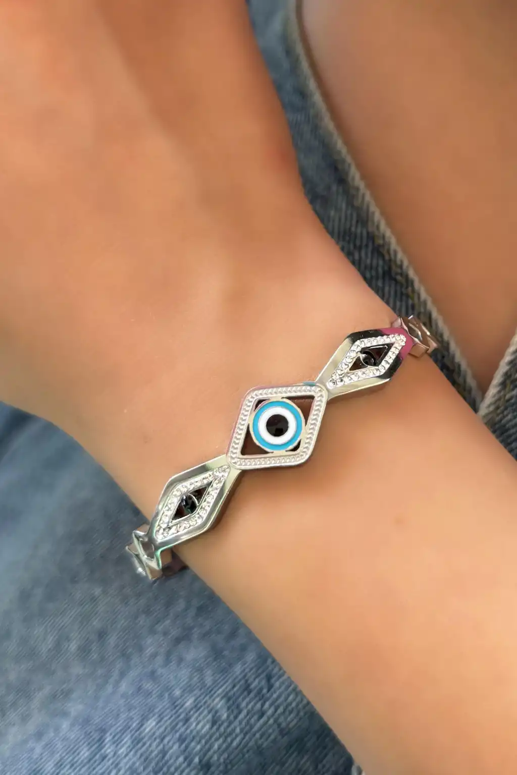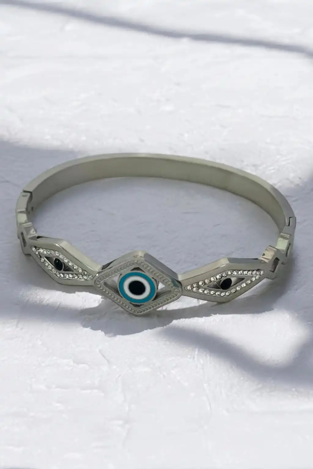 Gümüş Renk Göz Figürlü Taş Detaylı Çelik Kelepçe Bileklik