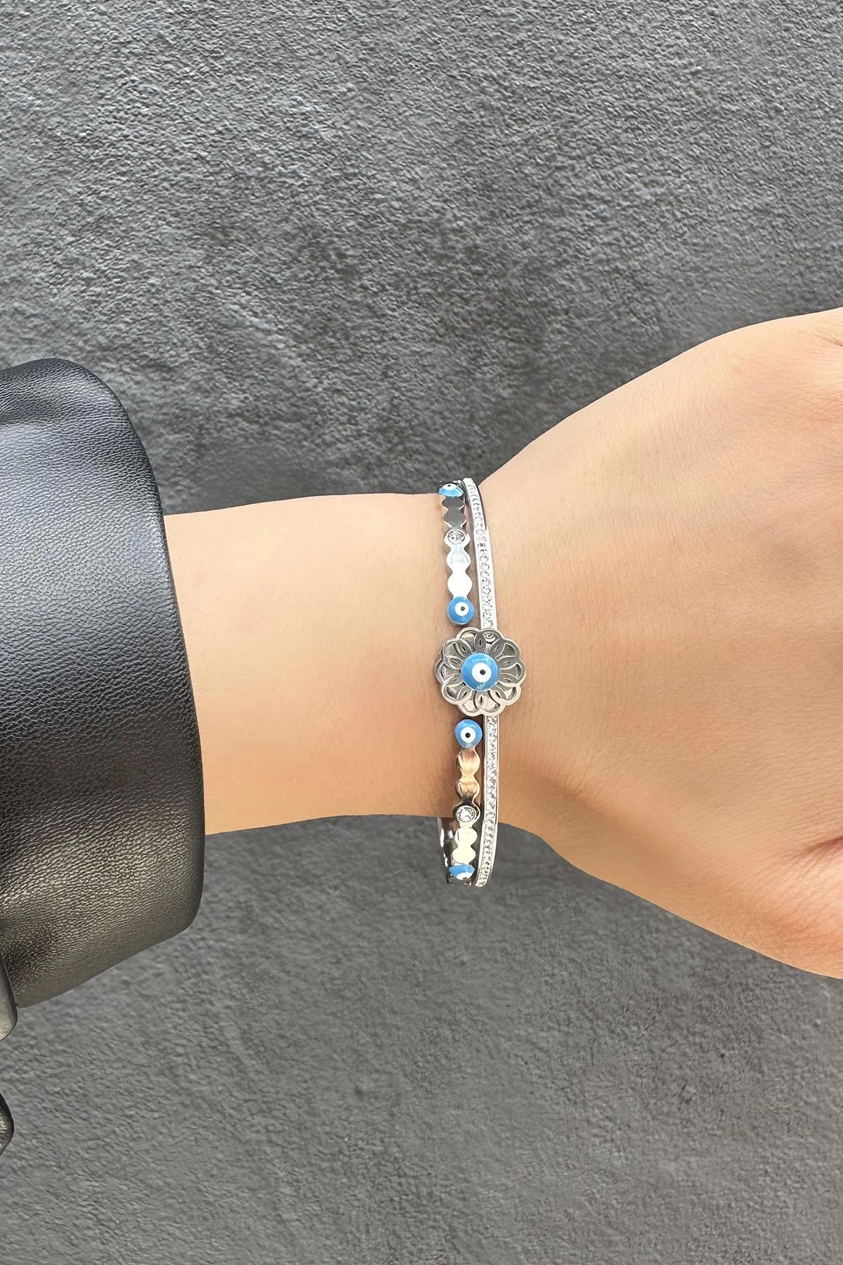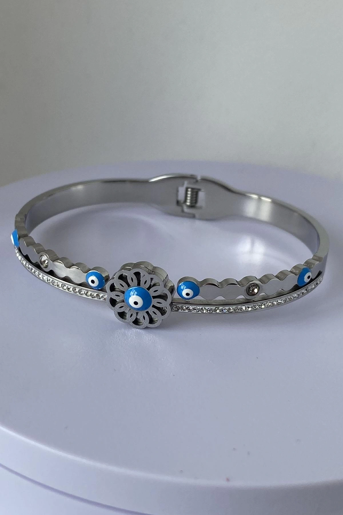 Gümüş Renk Nazar Boncuğu Figürlü Çelik Kelepçe Bileklik