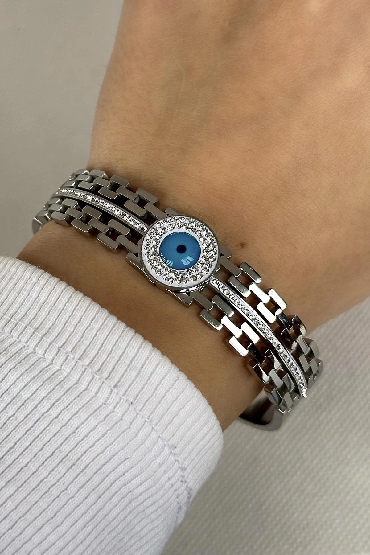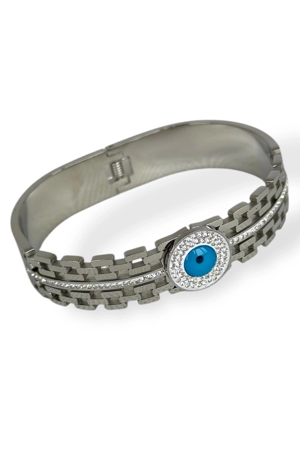 Gümüş Renk Nazar Boncuğu Figürlü Taş Detaylı Çelik Kelepçe Bileklik