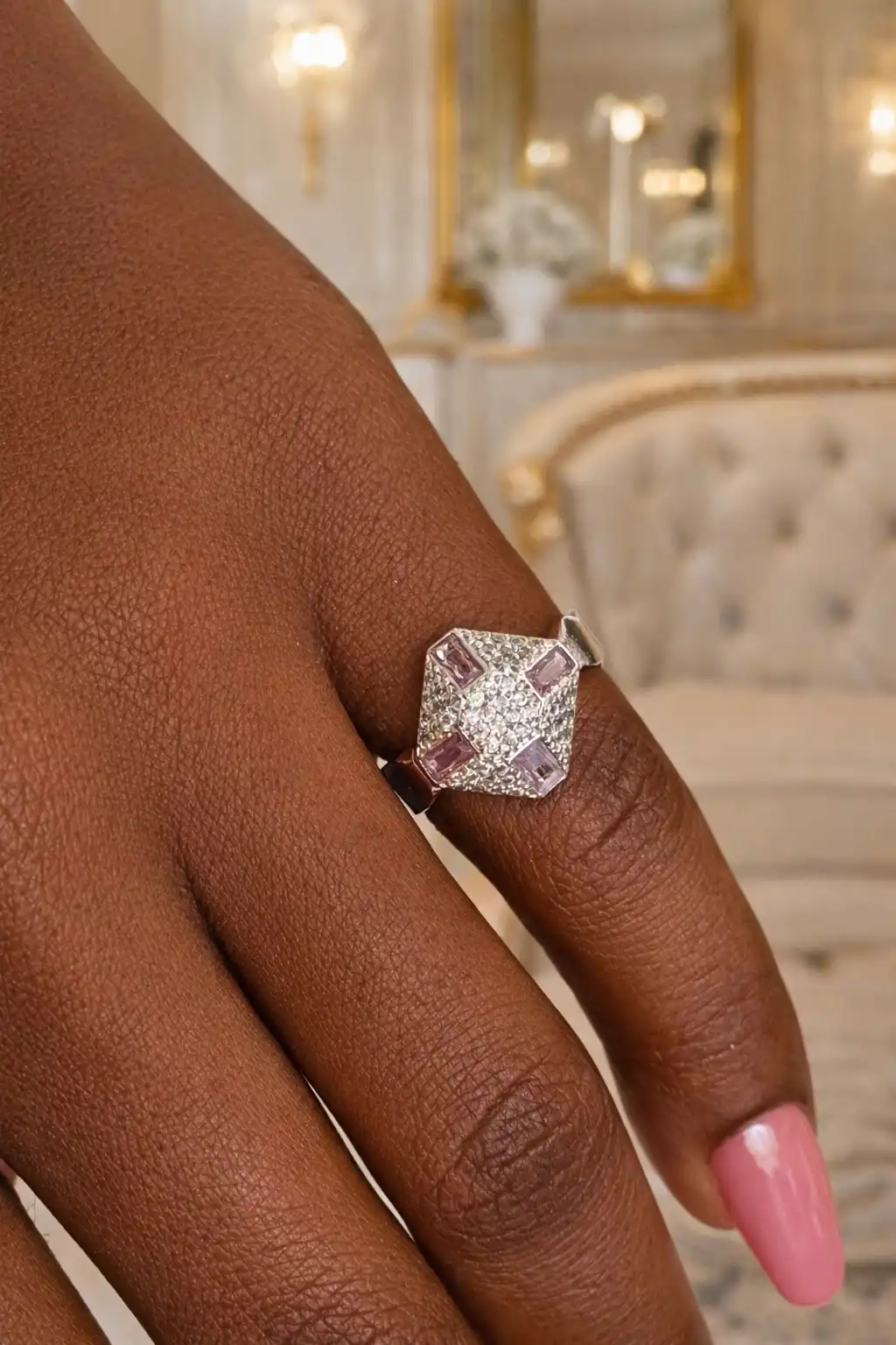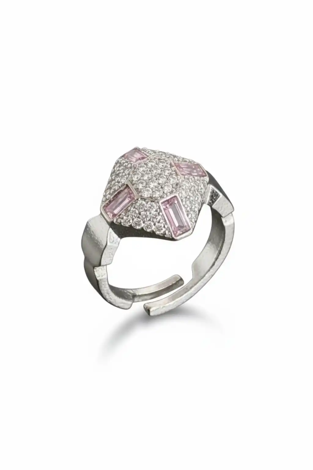Gümüş Renk Pembe Taş Detaylı Serçe Parmak Yüzük (Ayarlanabilir)