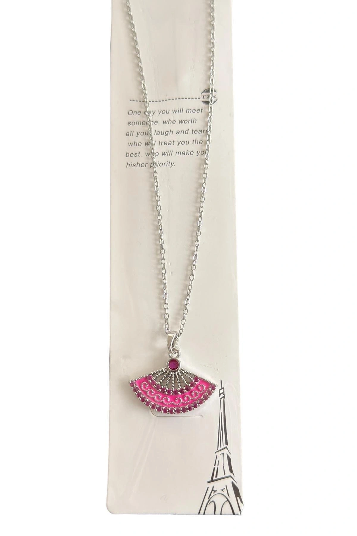 Gümüş Renk Pembe Yelpaze Detaylı Çelik Kolye