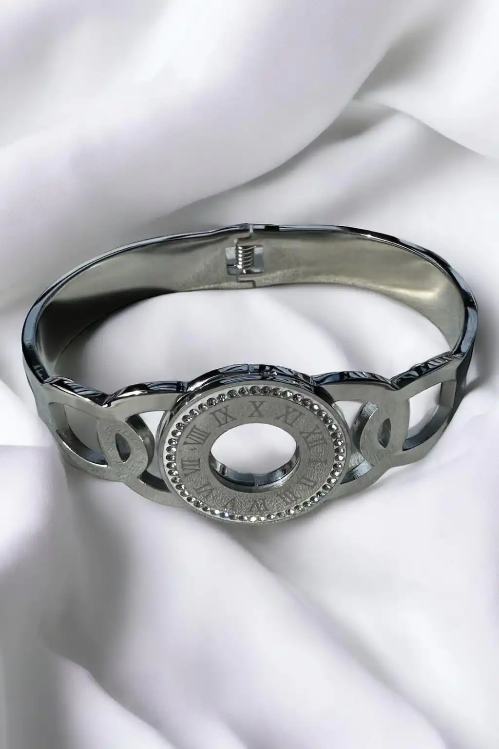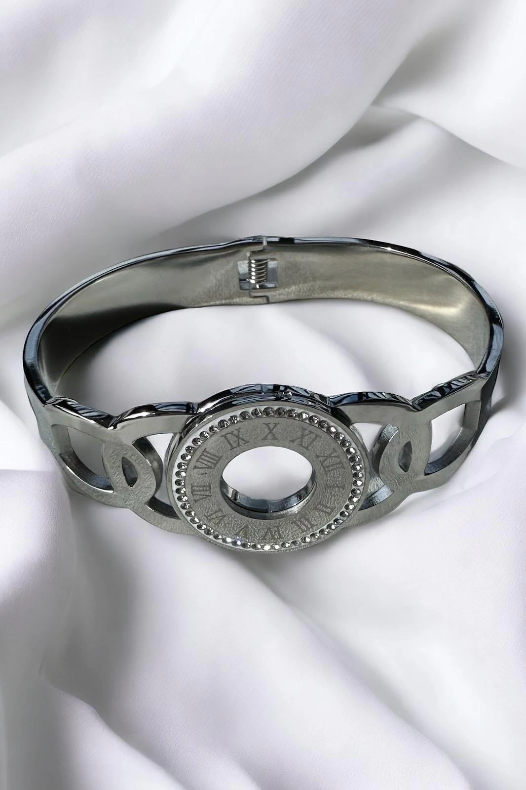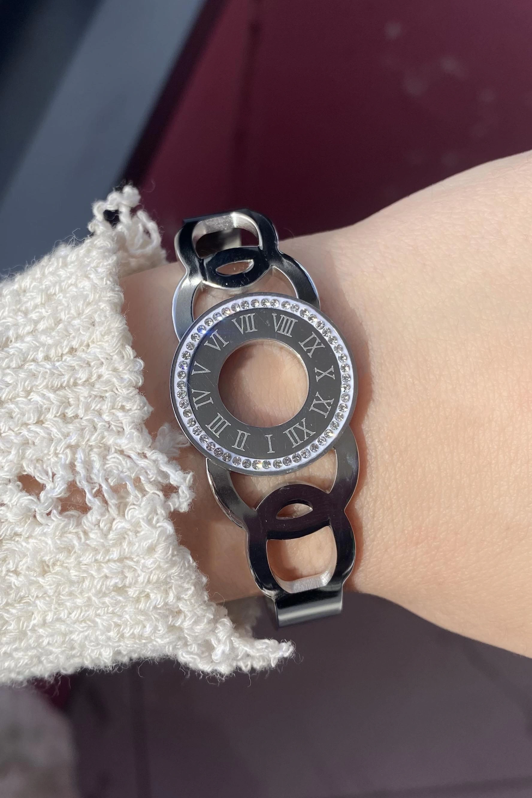 Gümüş Renk Romen Rakamlı Taşlı Çelik Bileklik
