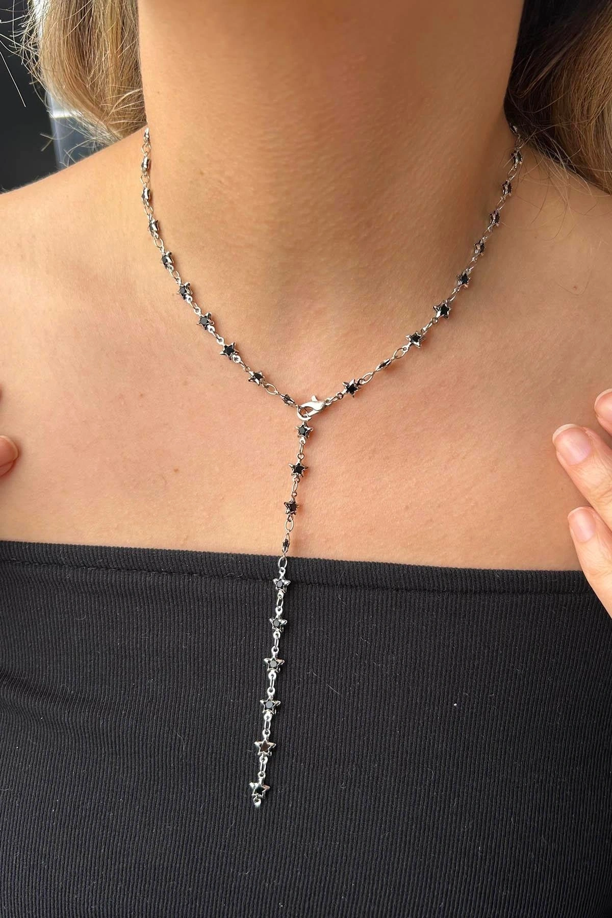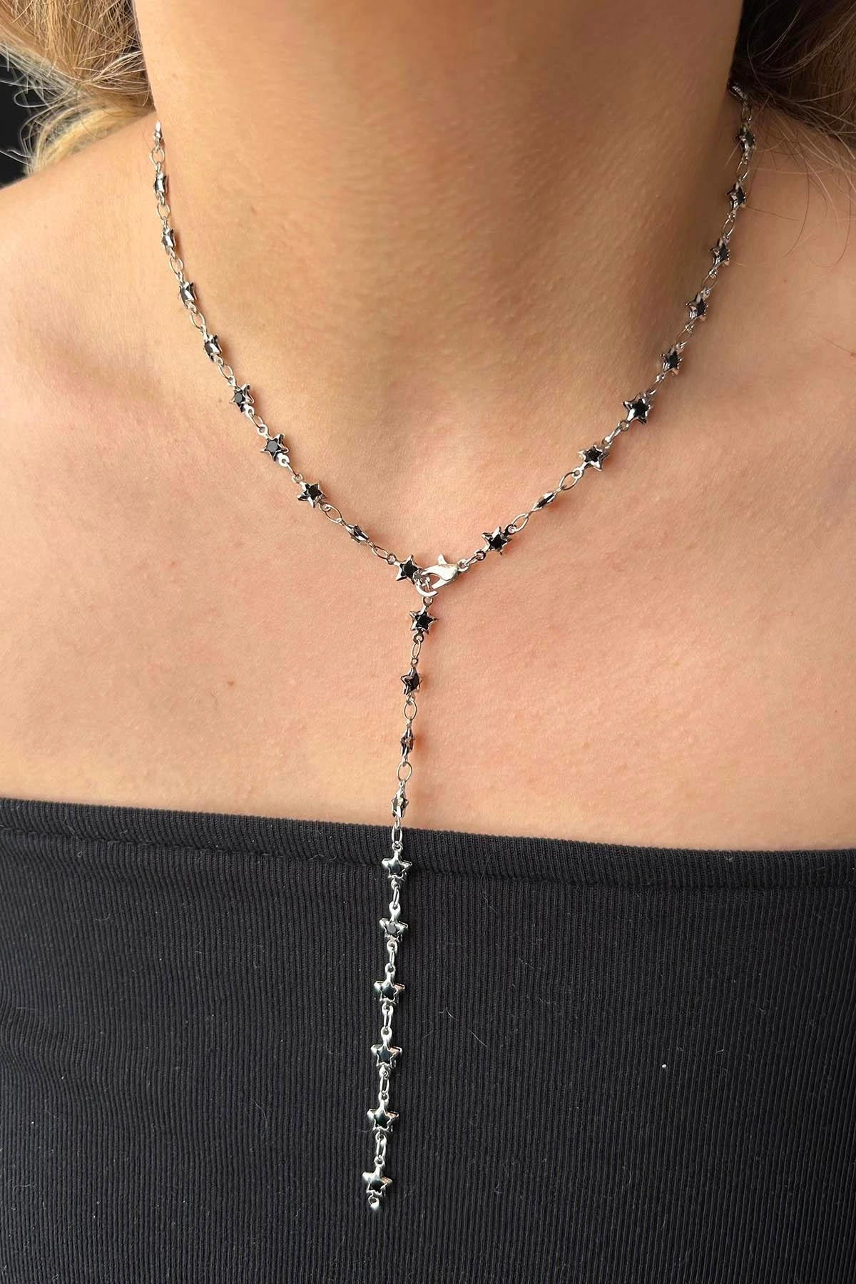 Gümüş Renk Siyah Taşlı Yıldız Figürlü Çelik Y Kolye