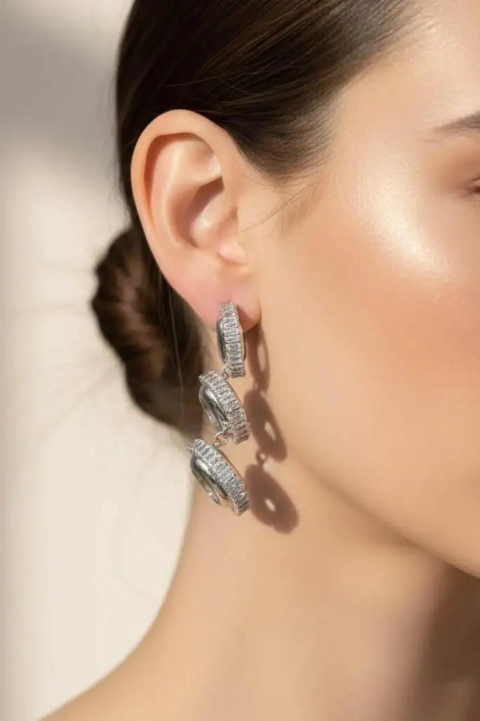 Gümüş Renk Üçlü Delik Görünümlü 14k Altın Kaplama Küpe (Çift)