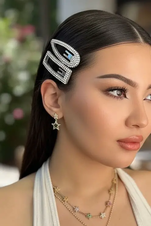 Gümüş Renk Hologram Taş Detaylı İkili Yan Toka