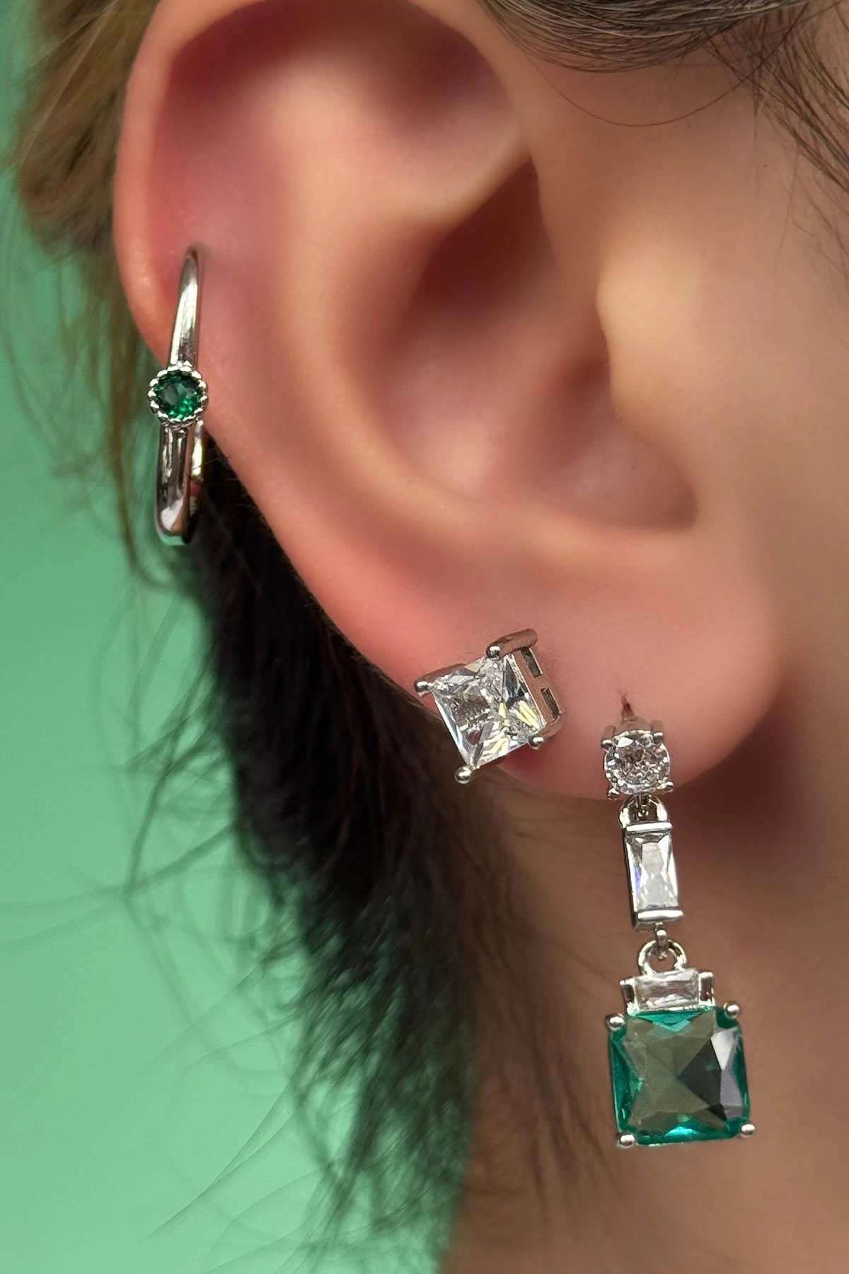 Gümüş Renk Taş Detaylı 3'lü YSX Küpe Set