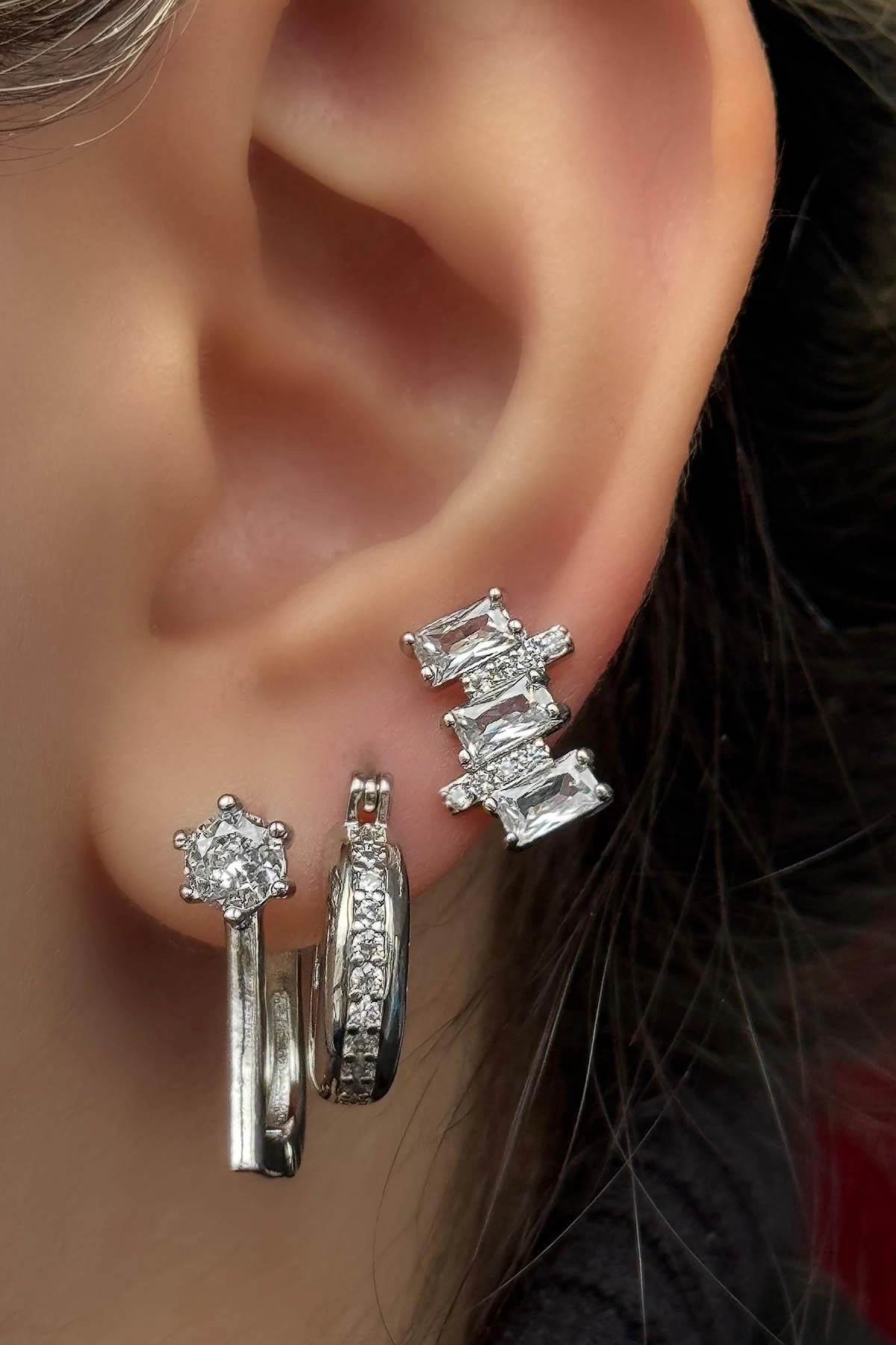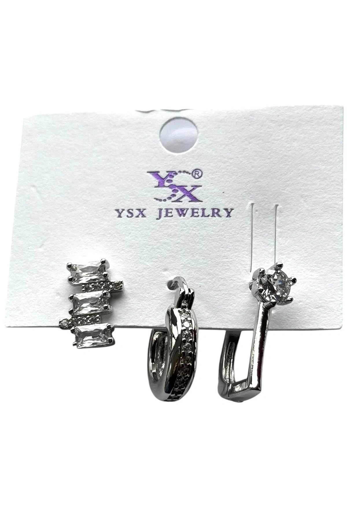 Gümüş Renk Taş Detaylı 3'lü YSX Küpe Set