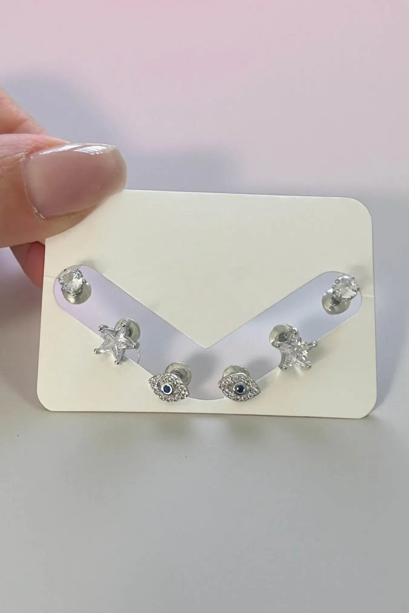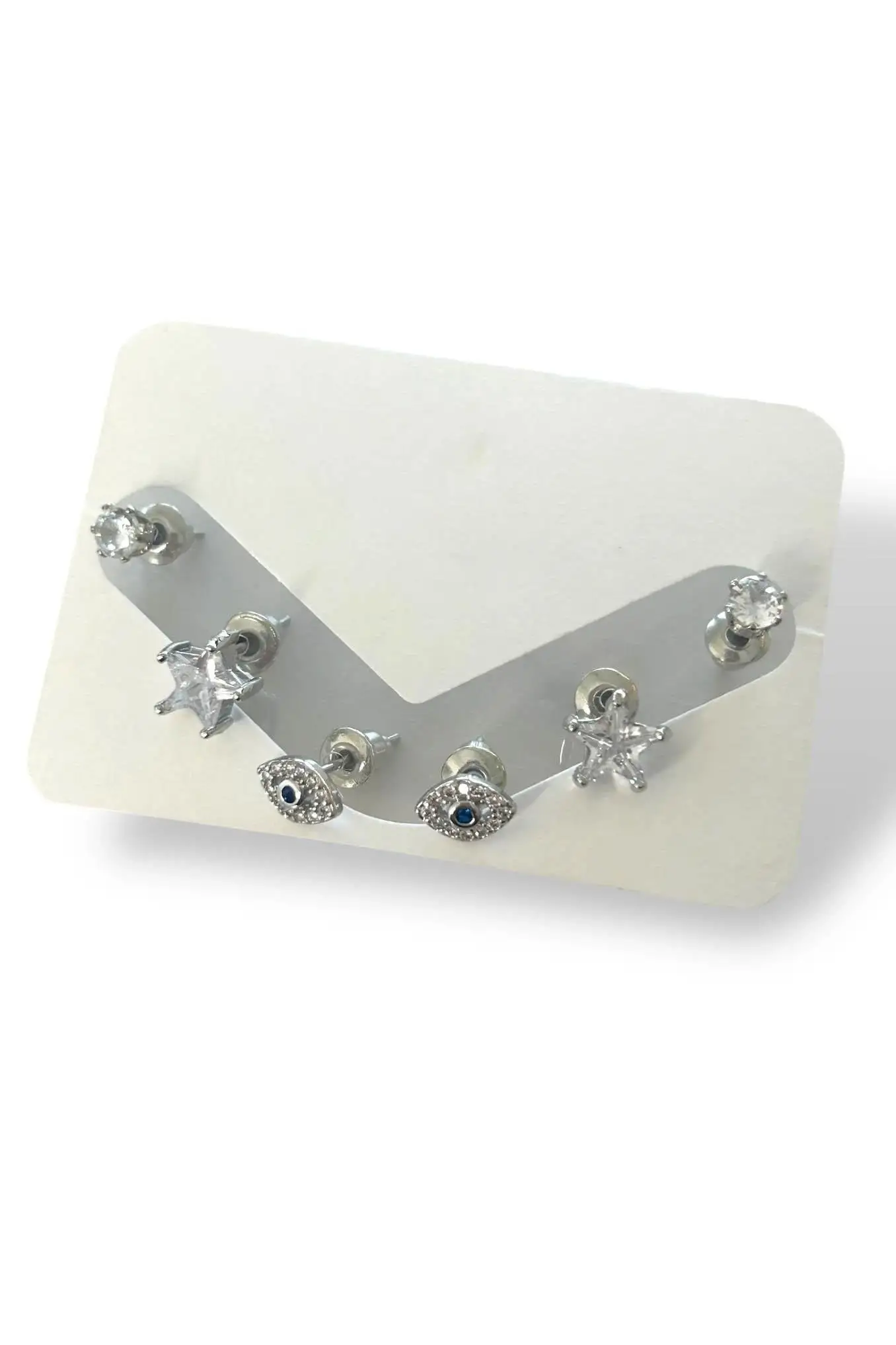 Gümüş Renk Taş Detaylı 6'lı Küpe Set