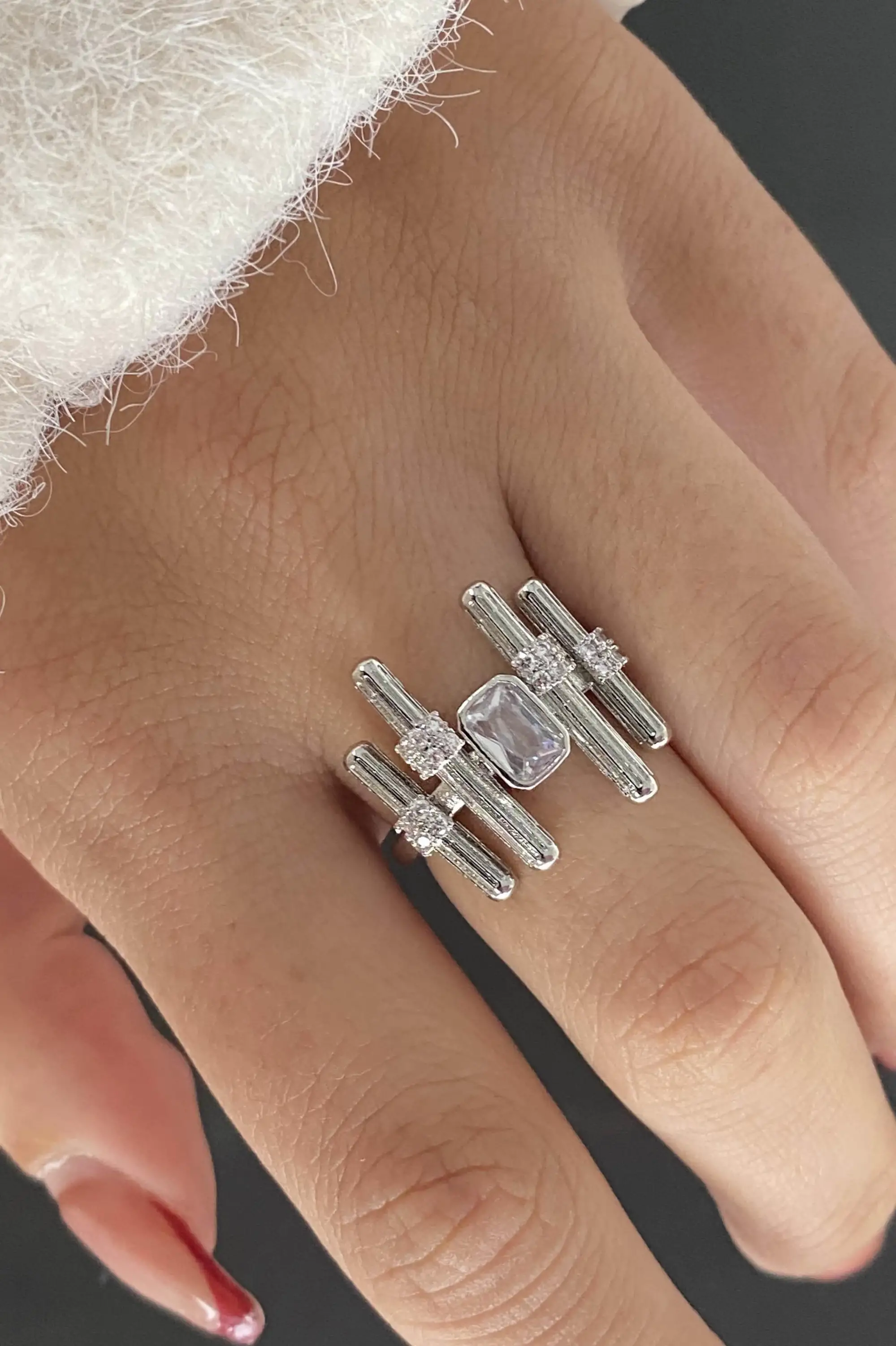Gümüş Renk Taş Detaylı Ayarlanabilir Çelik Yüzük