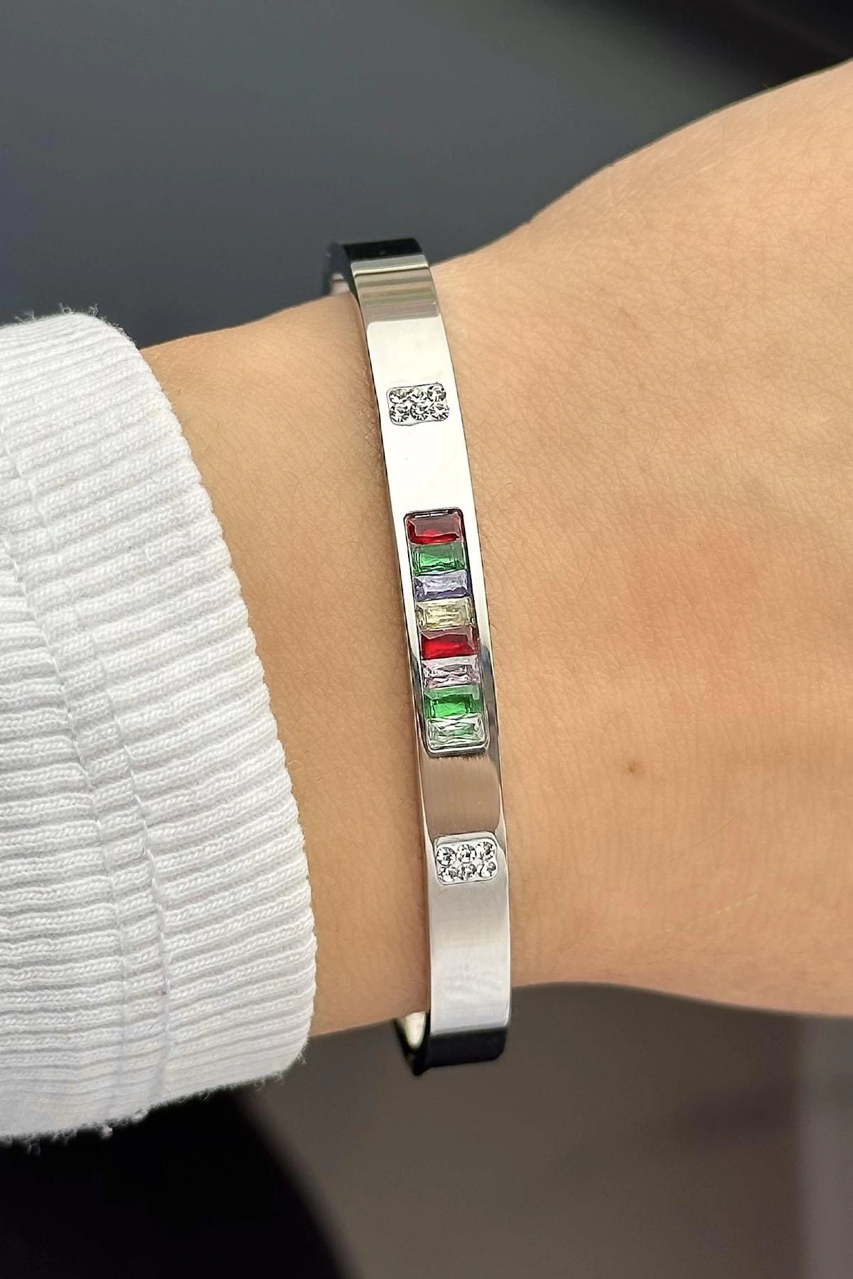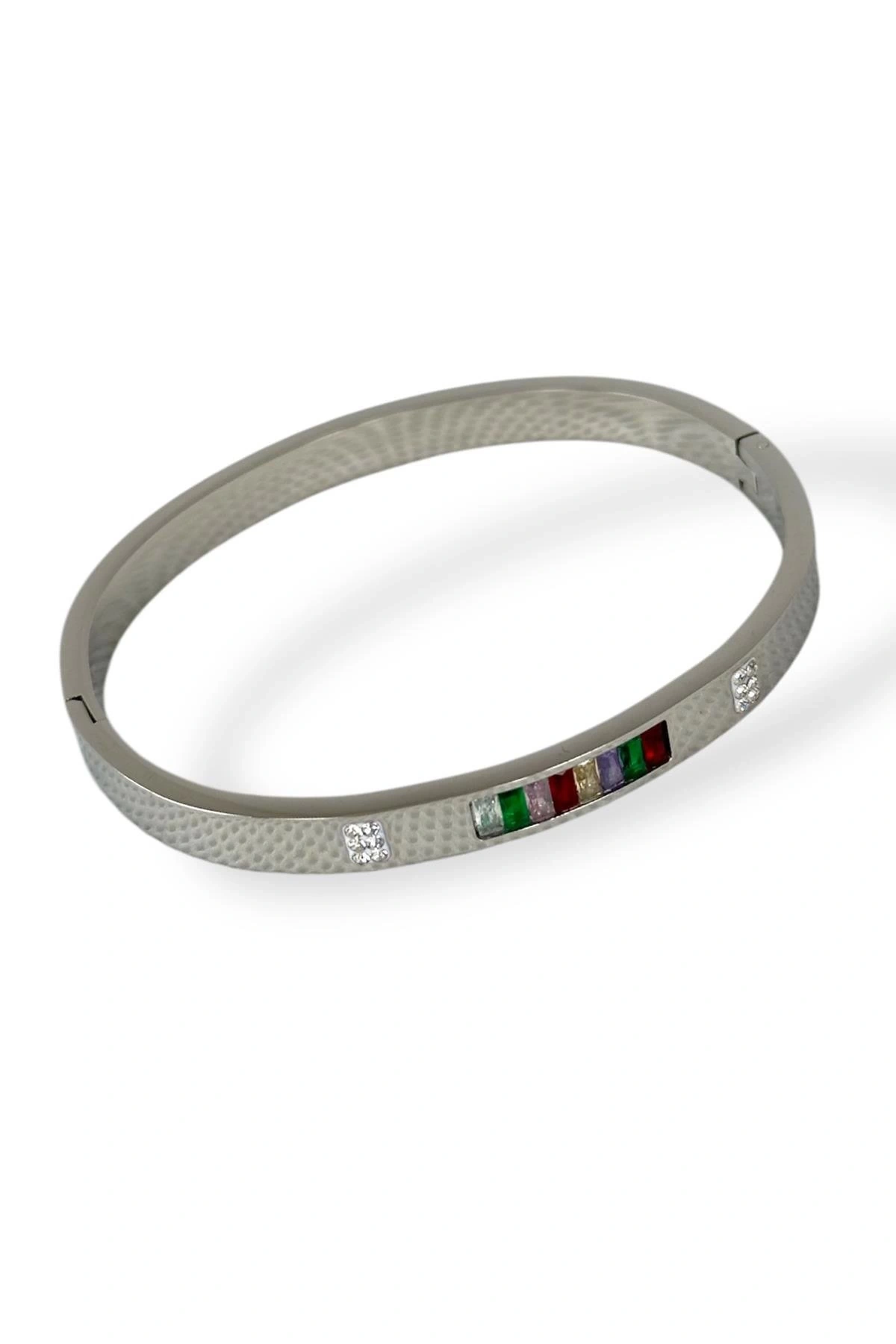 Gümüş Renk Taş Detaylı Çelik Kelepçe Bileklik