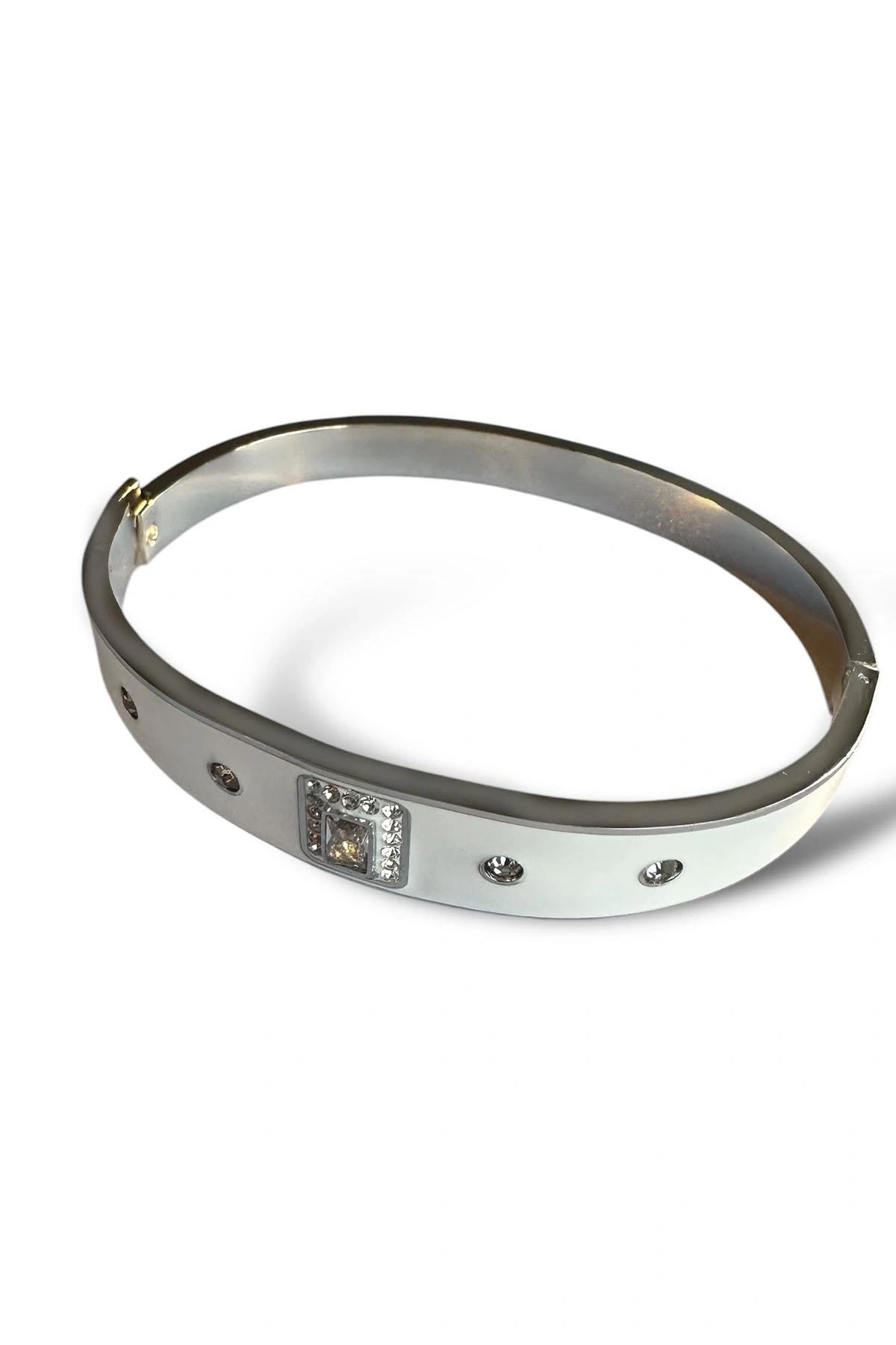 Gümüş Renk Taş Detaylı Çelik Kelepçe Bileklik