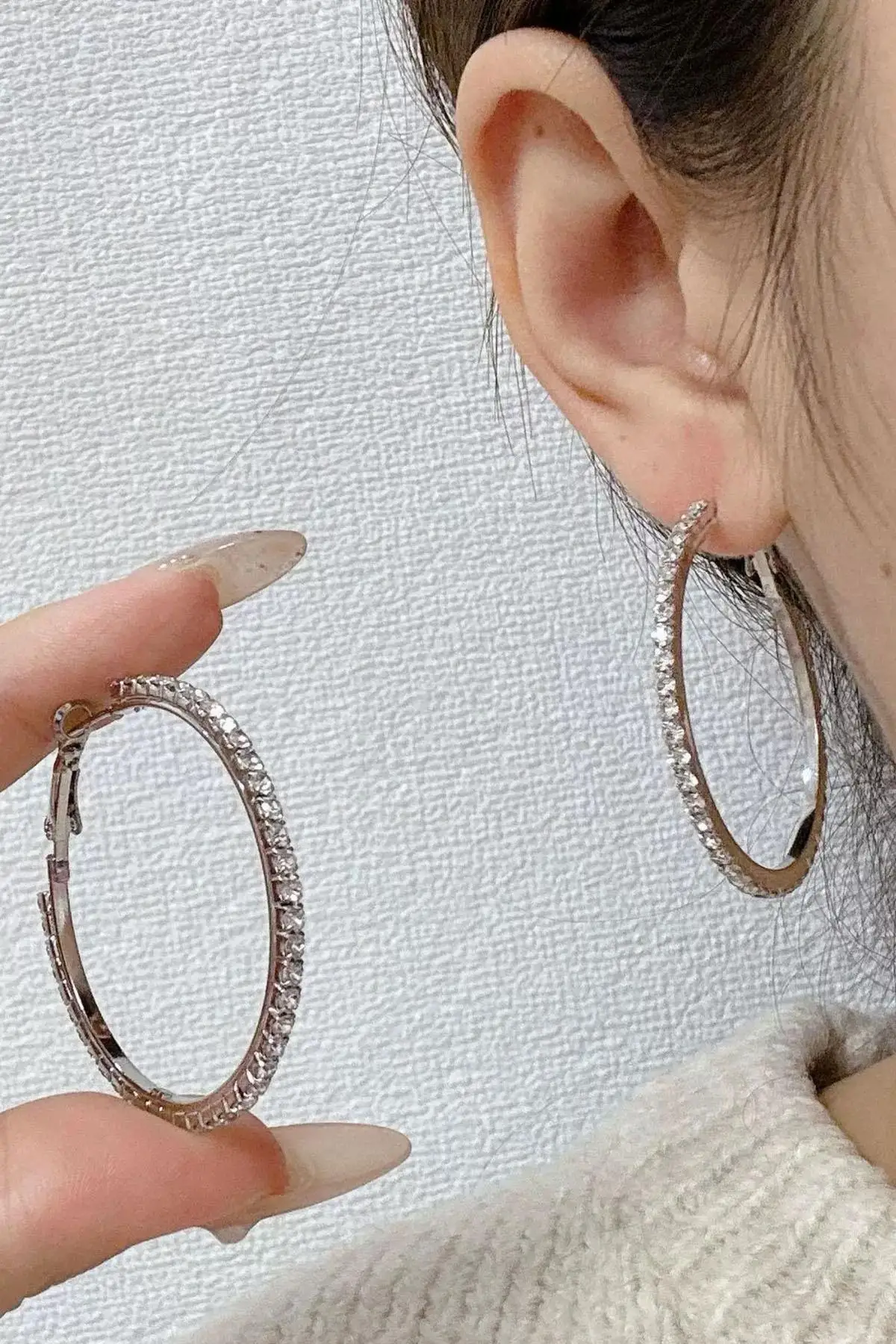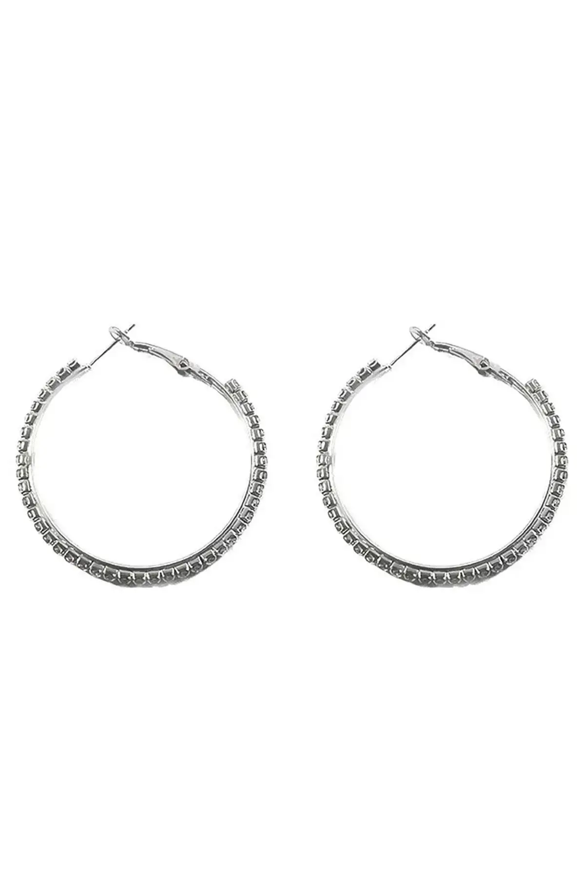 Gümüş Renk Taş Detaylı Halka Küpe 40Mm (Çift)