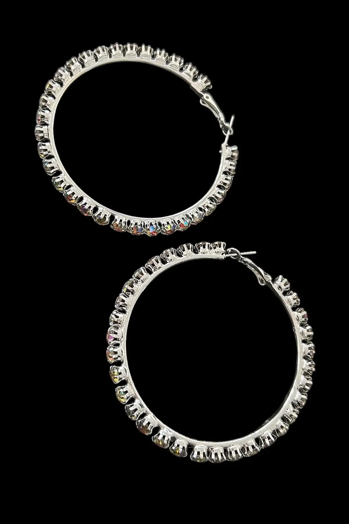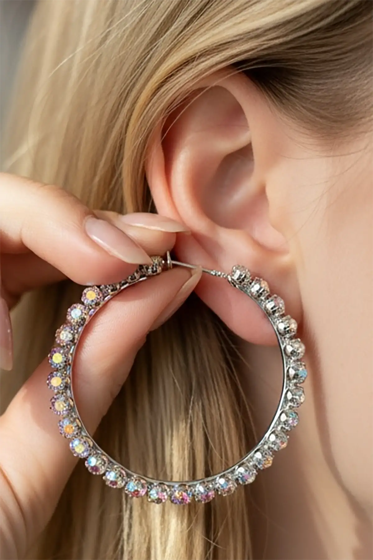 Gümüş Renk Taş Detaylı Halka Küpe 40Mm (Çift)