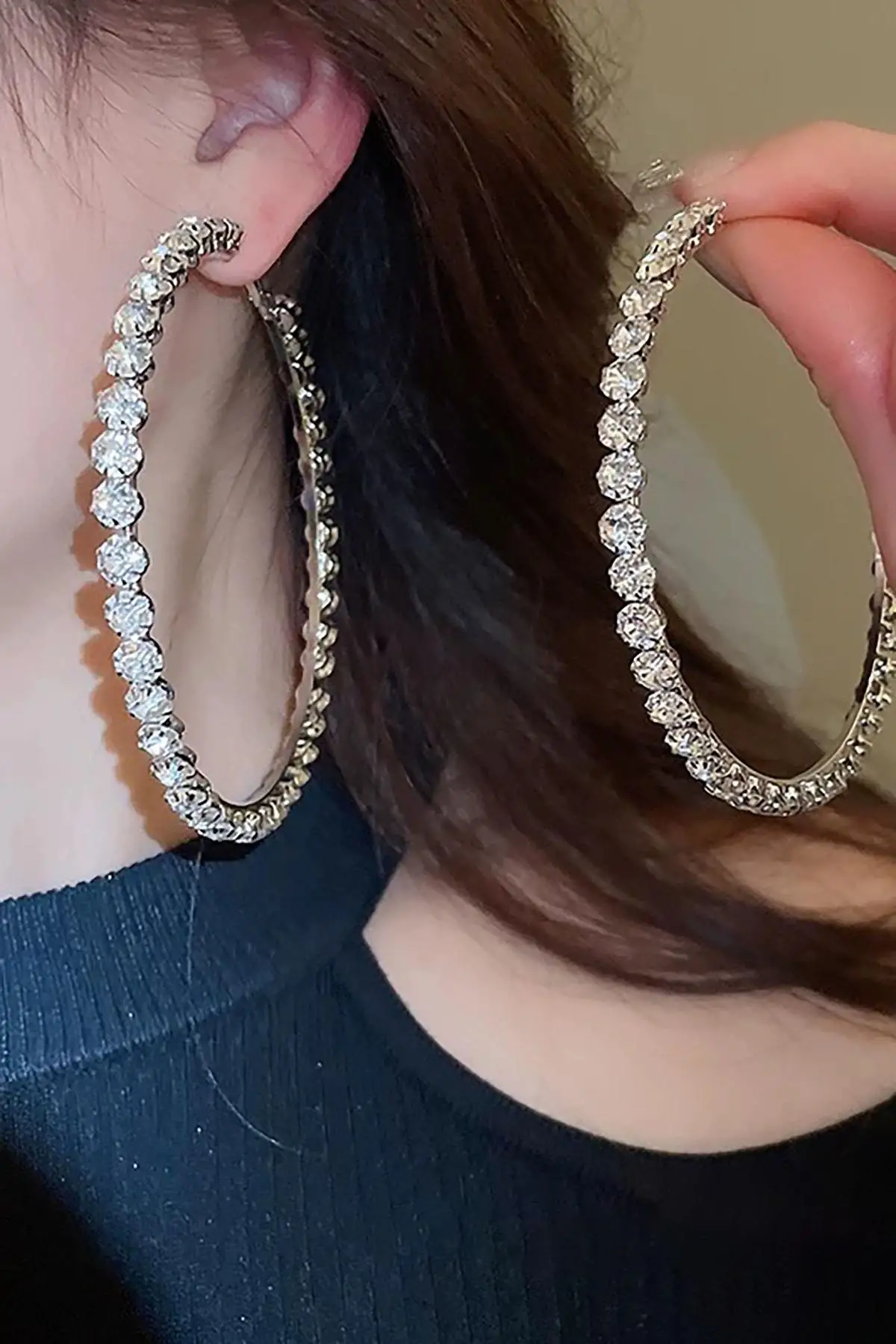Gümüş Renk Taş Detaylı Halka Küpe 80Mm (Çift)