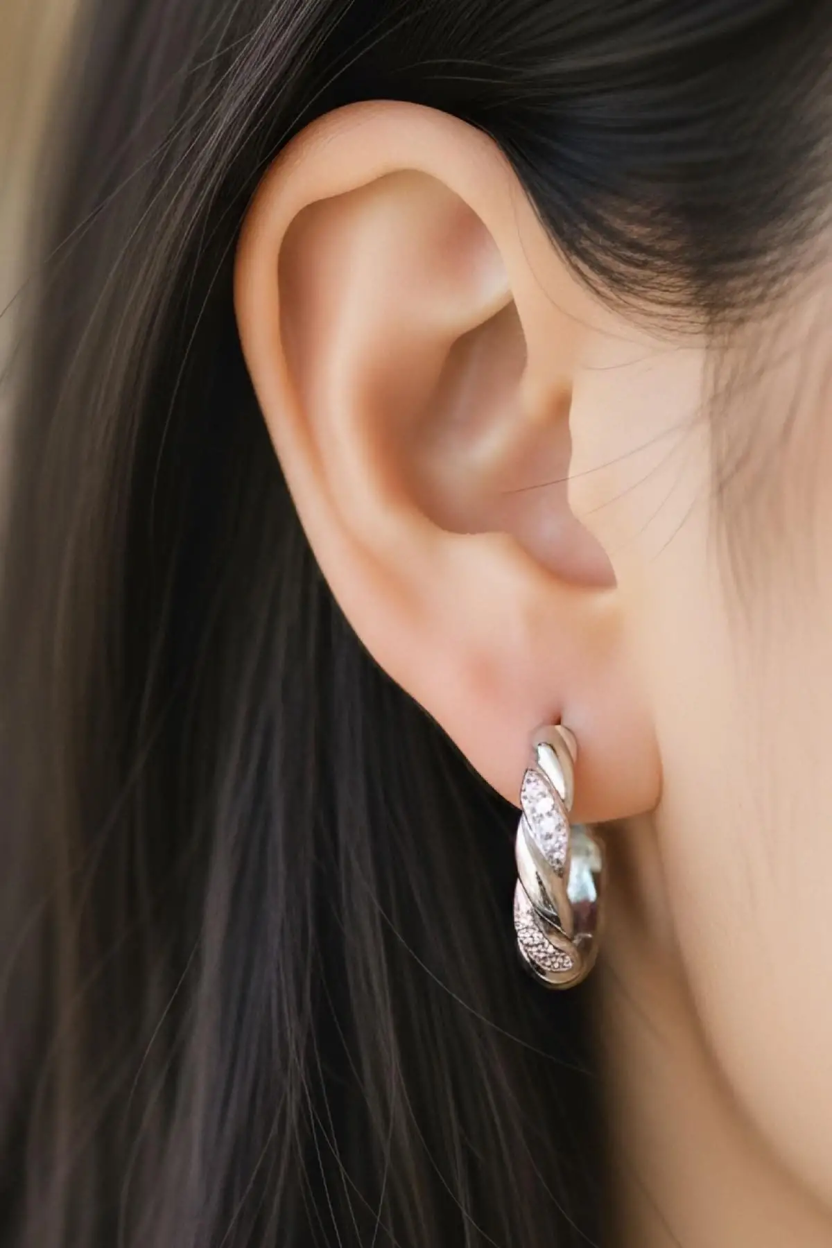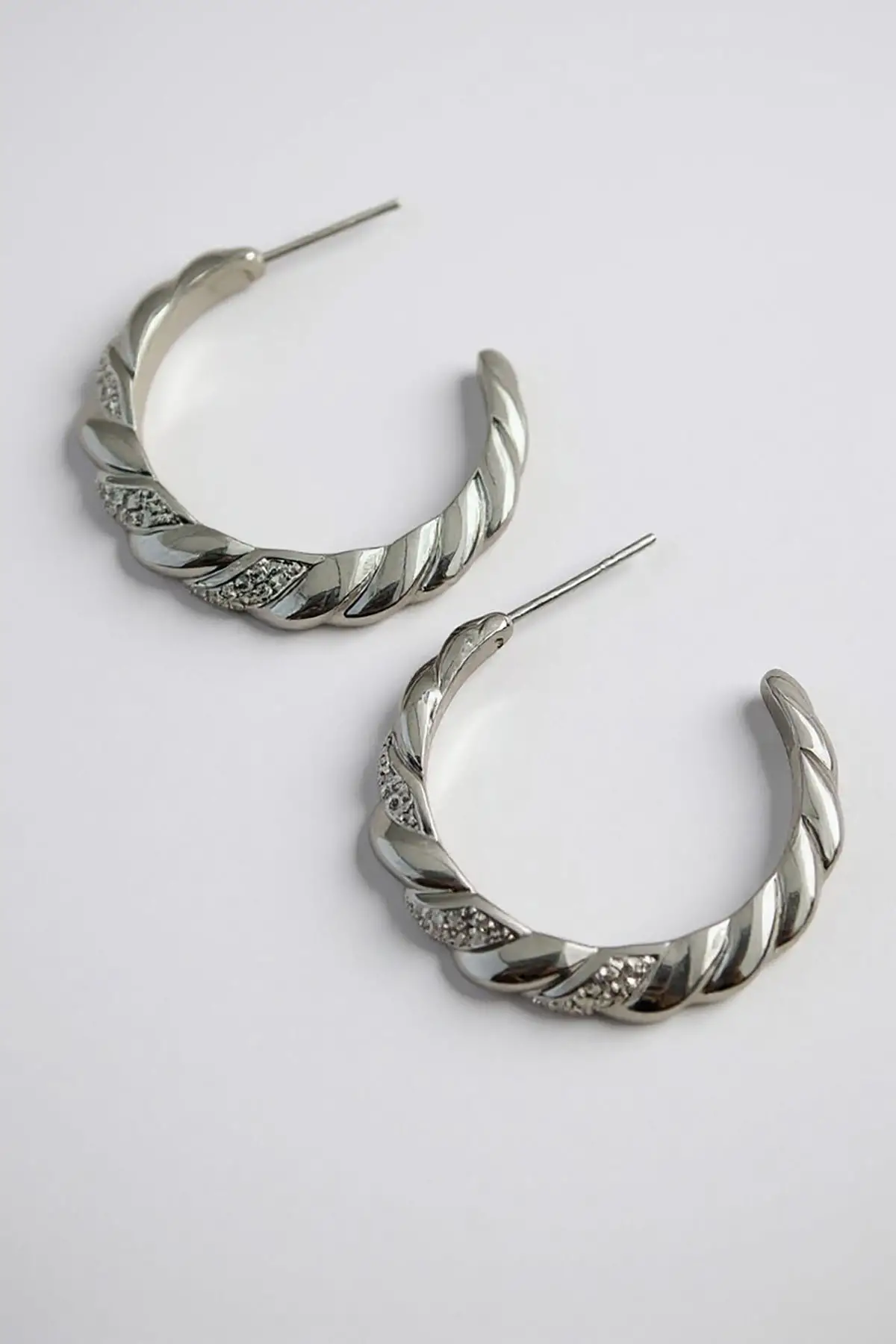 Gümüş Renk Taş Detaylı Halka Küpe (Çift)
