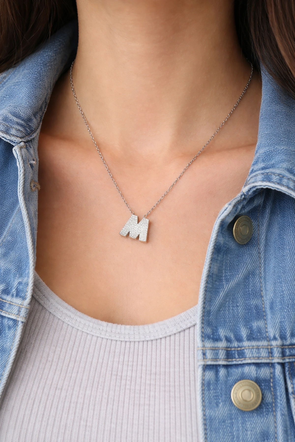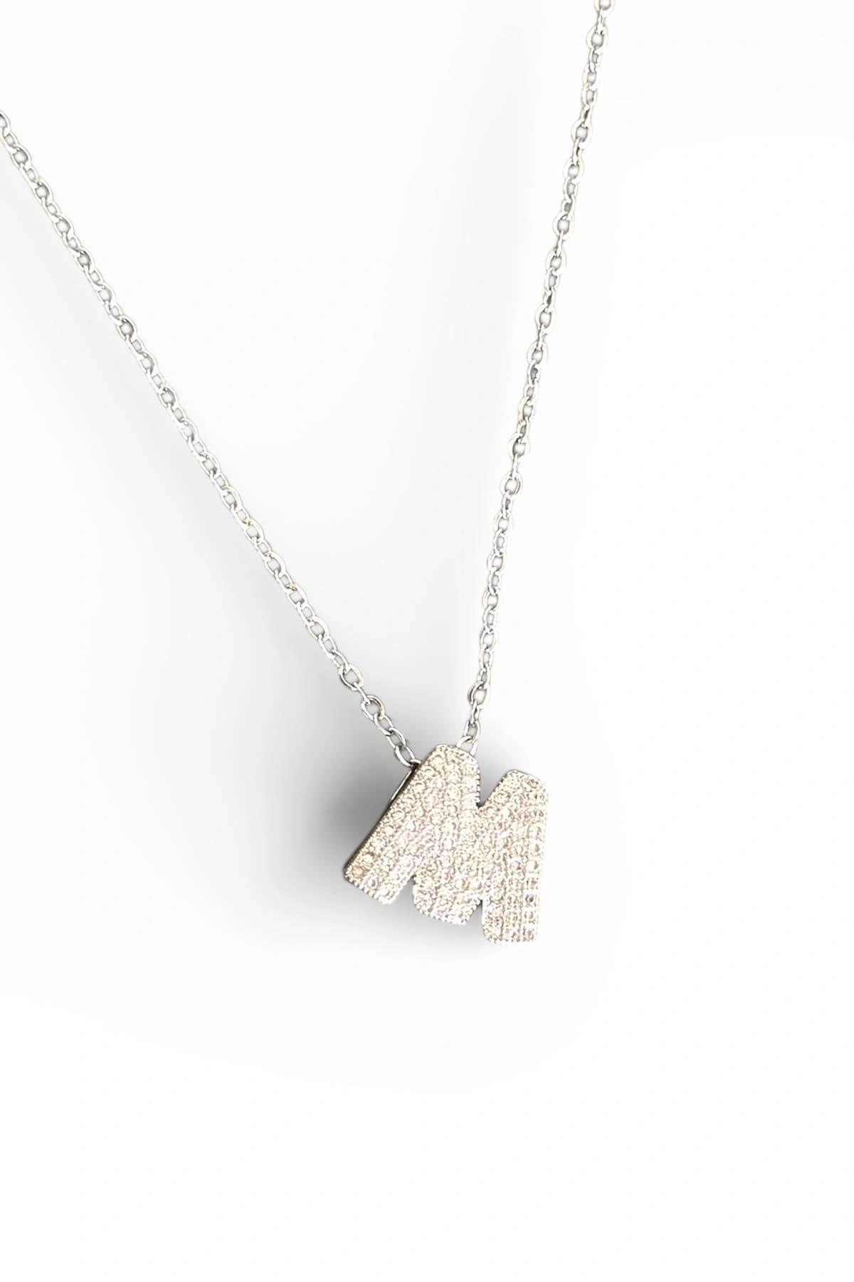Gümüş Renk Taş Detaylı M Harfli Çelik Kolye
