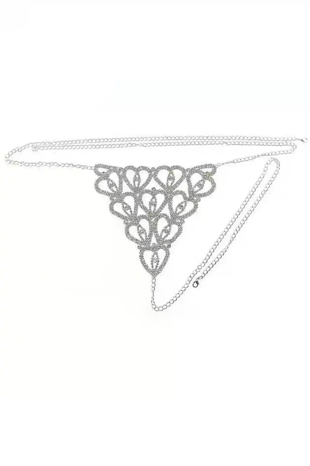 Gümüş Renk Kalp Figürlü Taş Detaylı Tasarım Bel Zinciri/Vücut Aksesuar