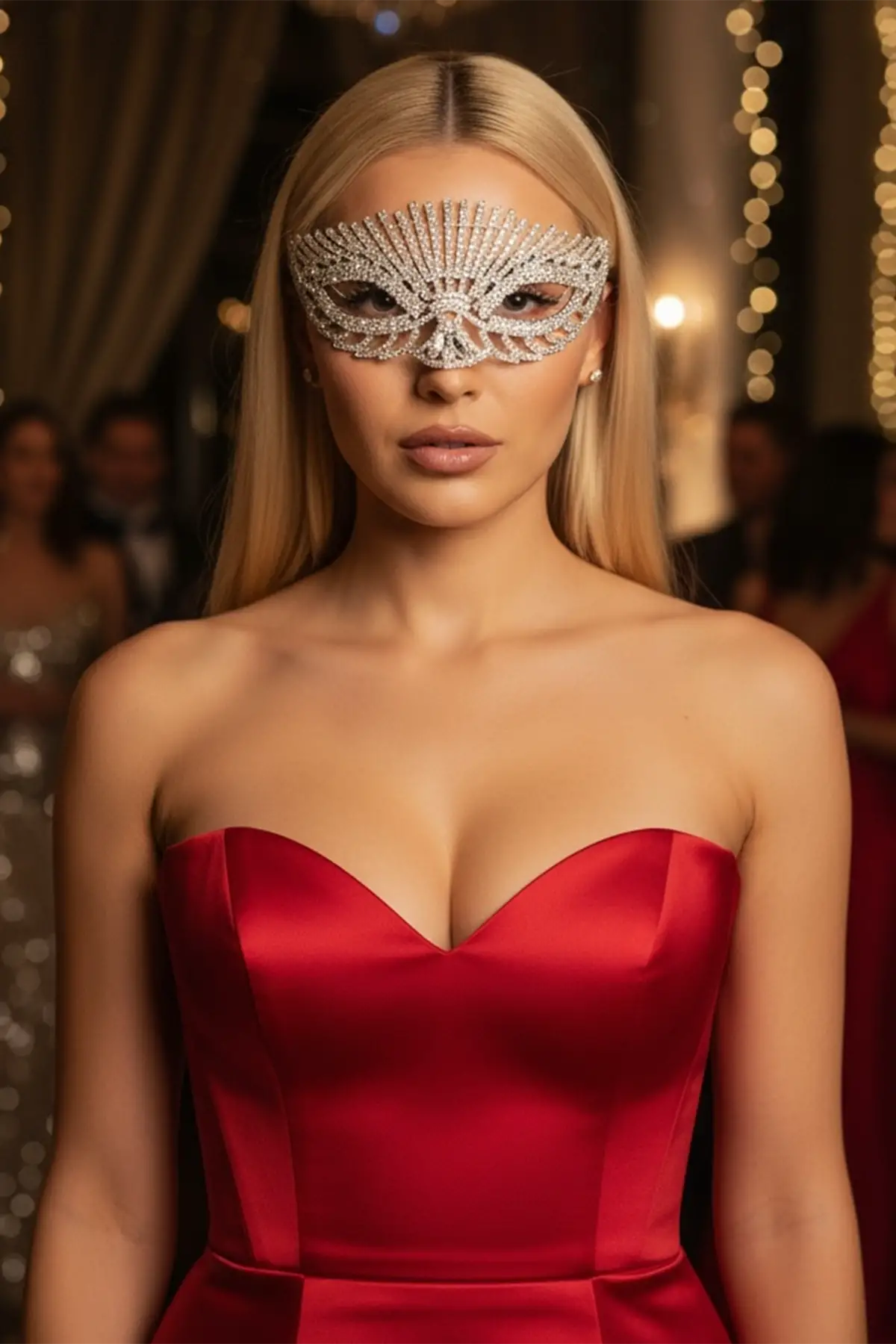 Bu taşlı yüz party maskesi, parti gecelerinde parıltınızı ve çekiciliğinizi artırmak için tasarlanmıştır. Zarif taş detayları ile süslenmiş olan bu maskenin altındaki yüzünüz, partinin en göz alıcı görüneni olacak.
