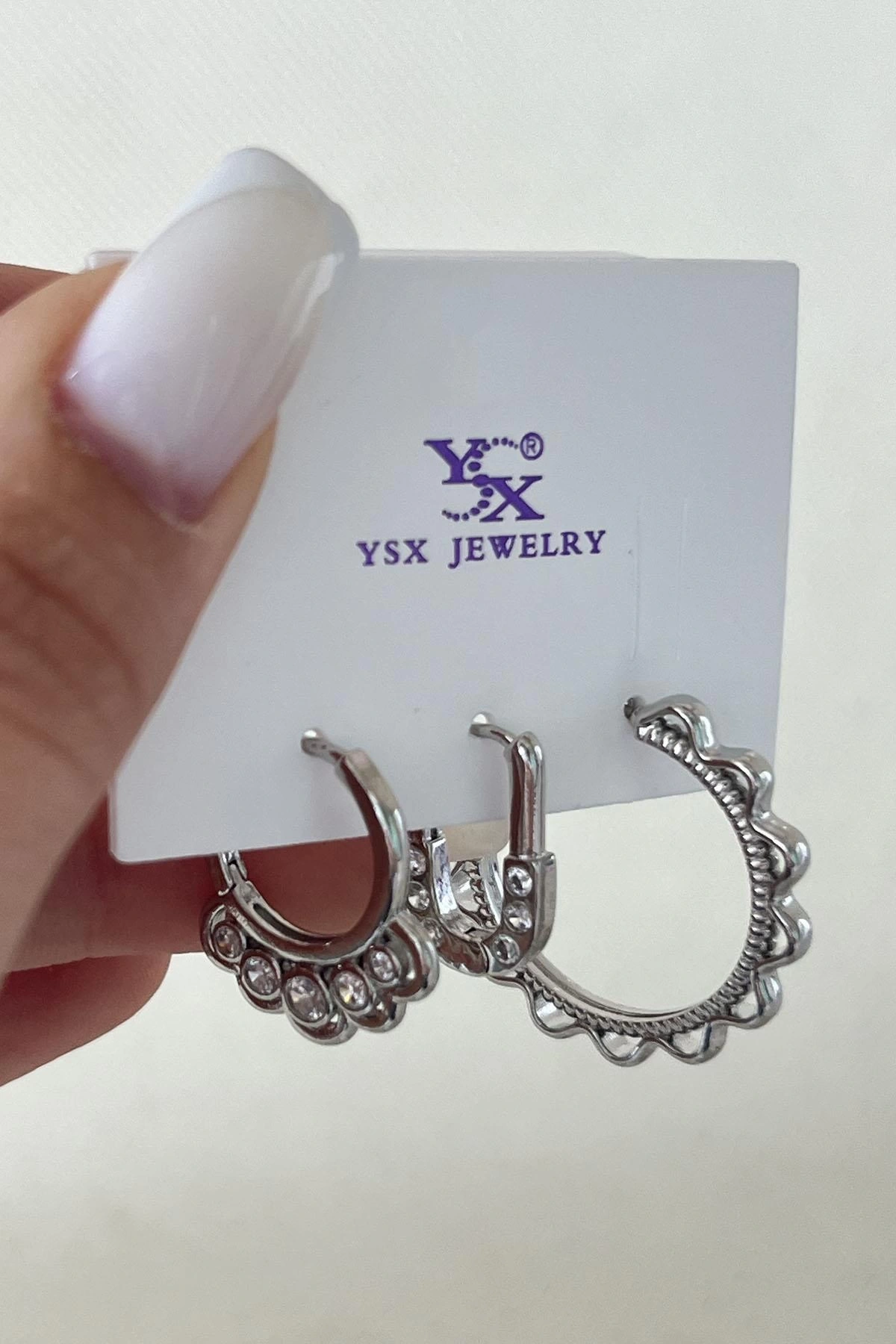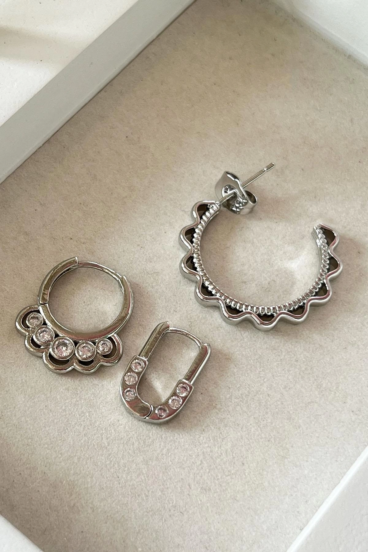 Gümüş Renk Taş Detaylı VİP 3'lü YSX Halka Küpe Set