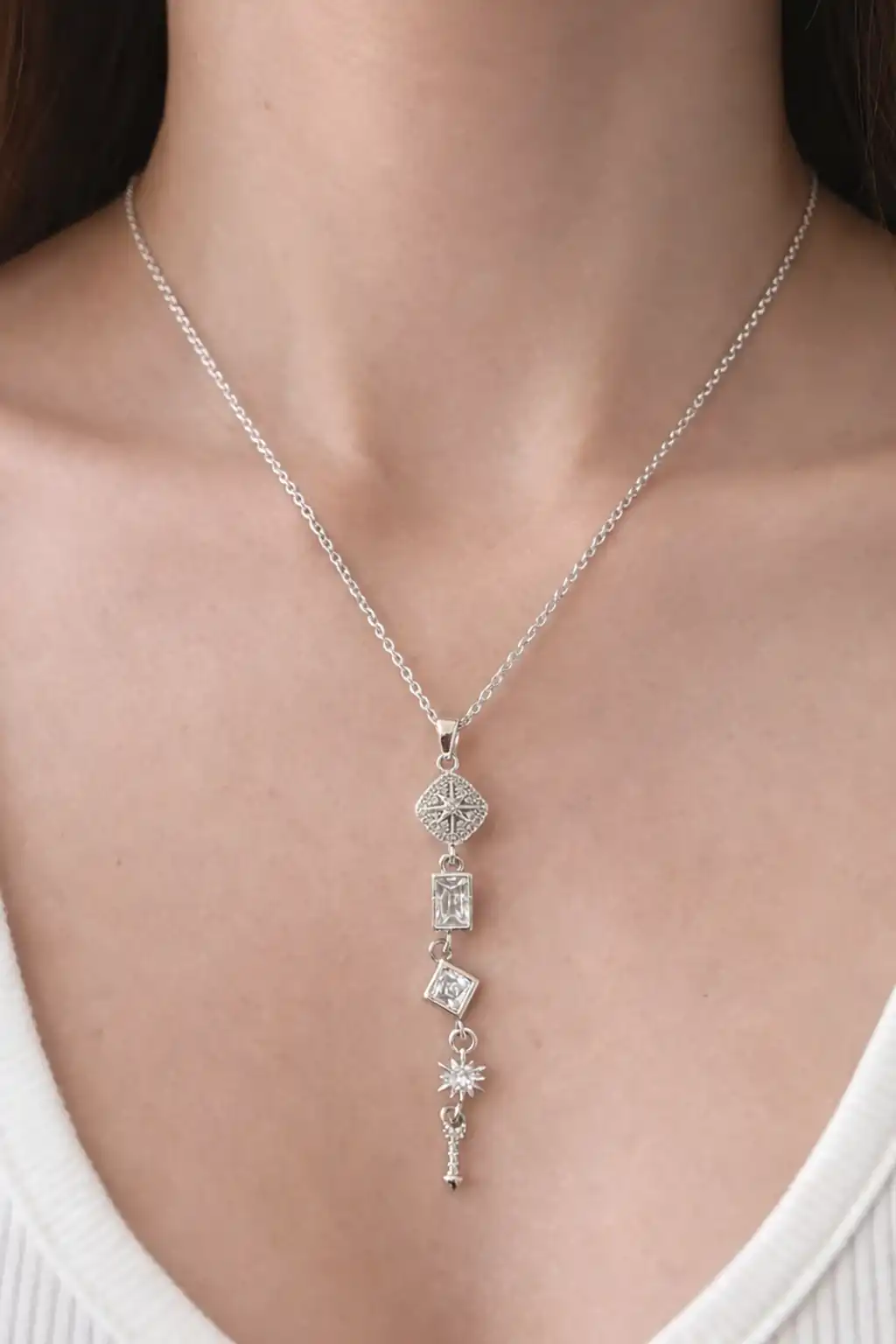 Gümüş Renk Taş Detaylı Y Kolye