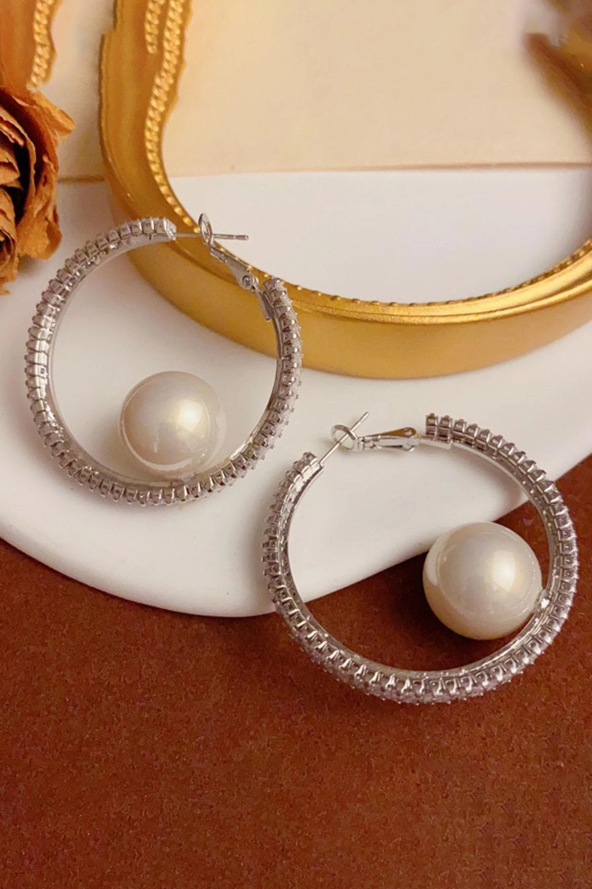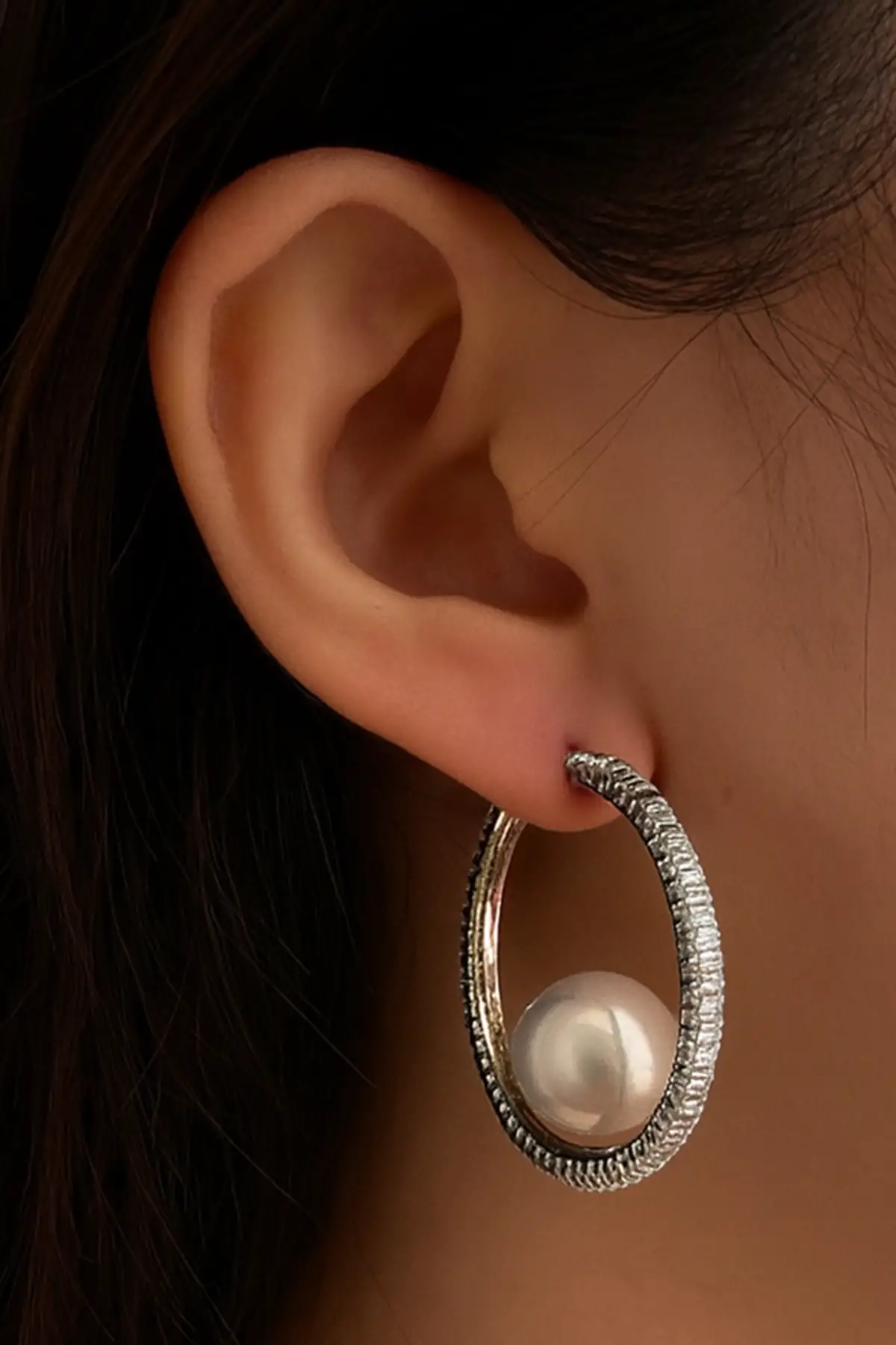 Gümüş Renk Taş Ve İnci Detaylı Halka Küpe (Çift)