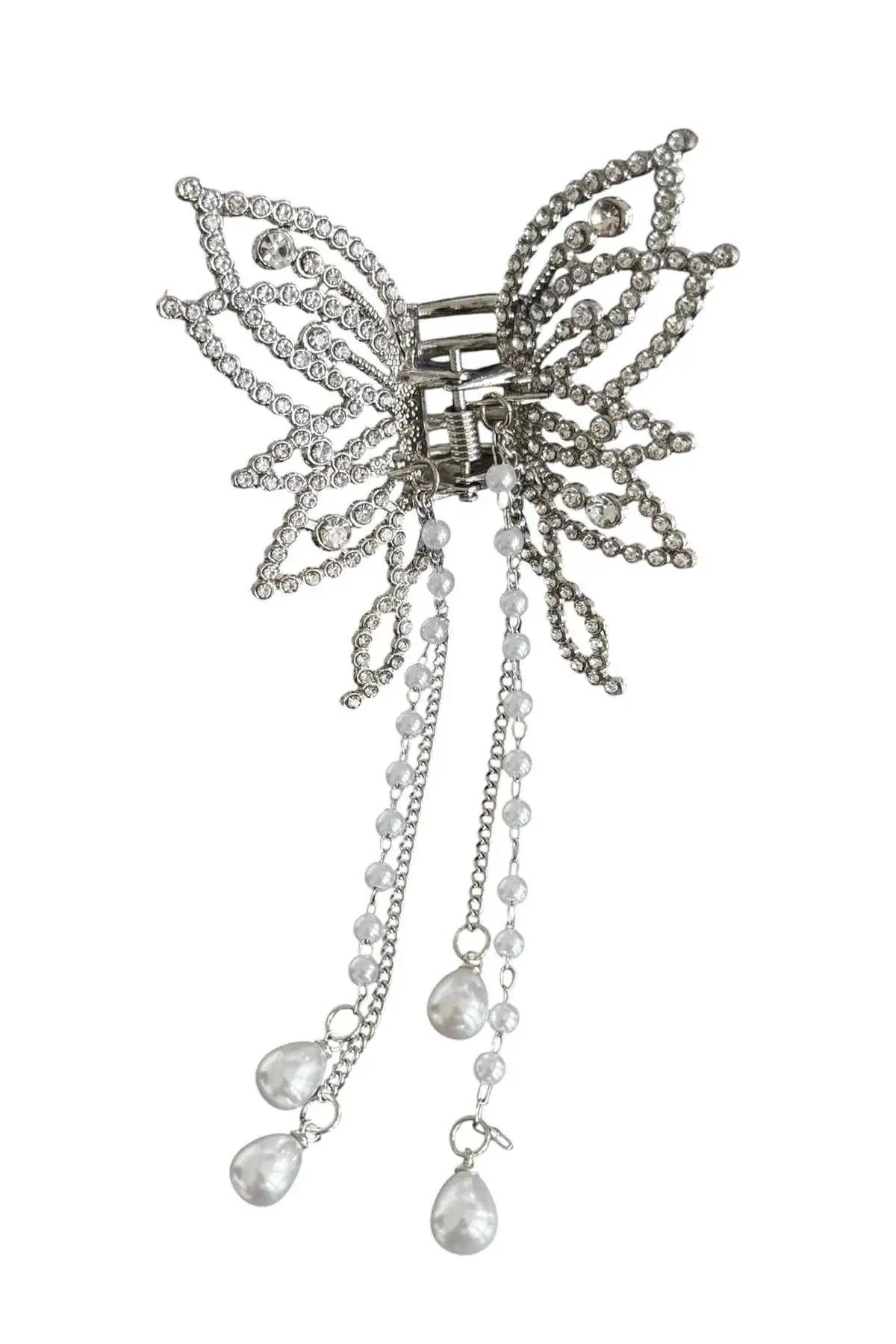 Gümüş Renk Taş Ve İnci Detaylı Kelebek Figürlü Sallantılı Mandal Toka