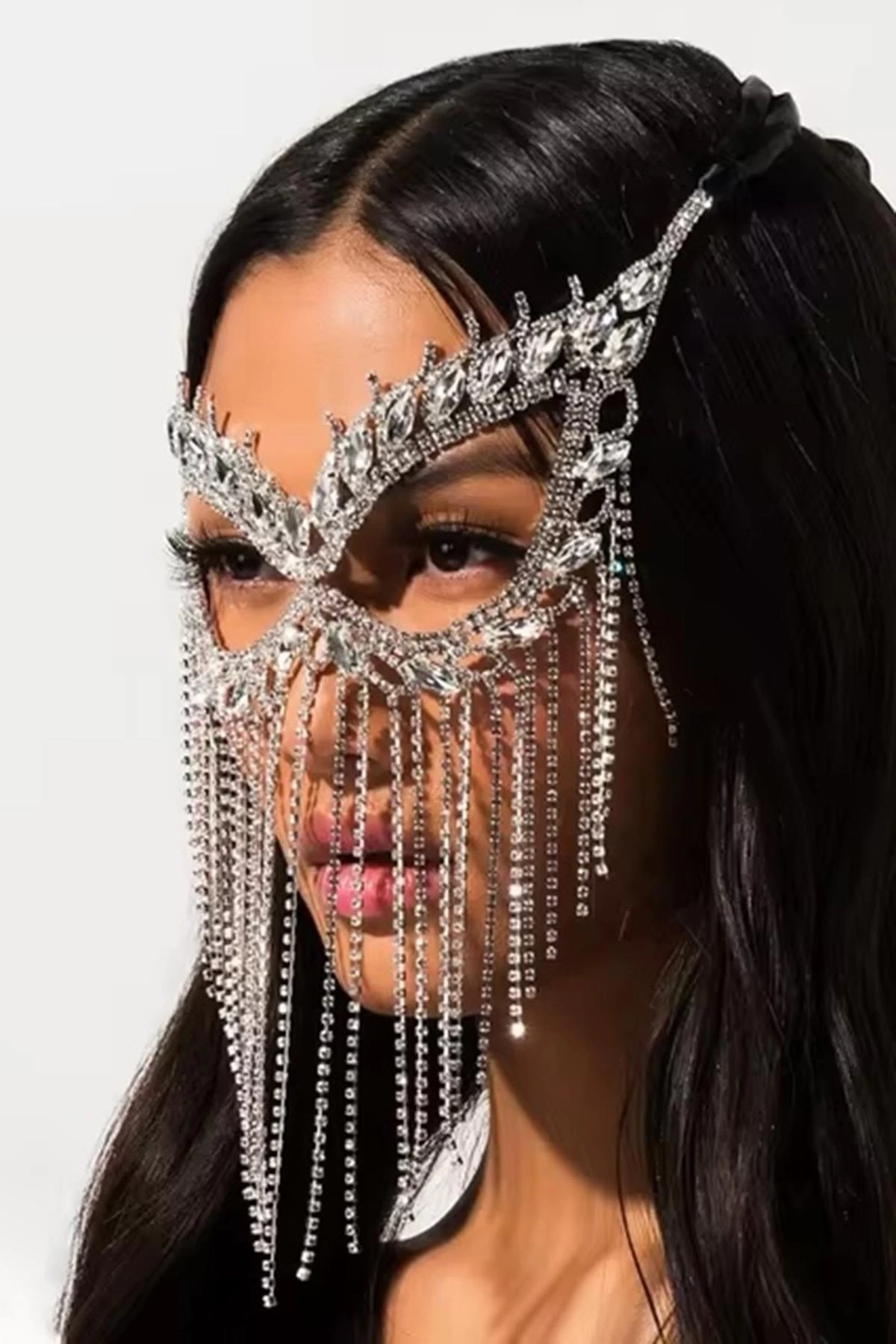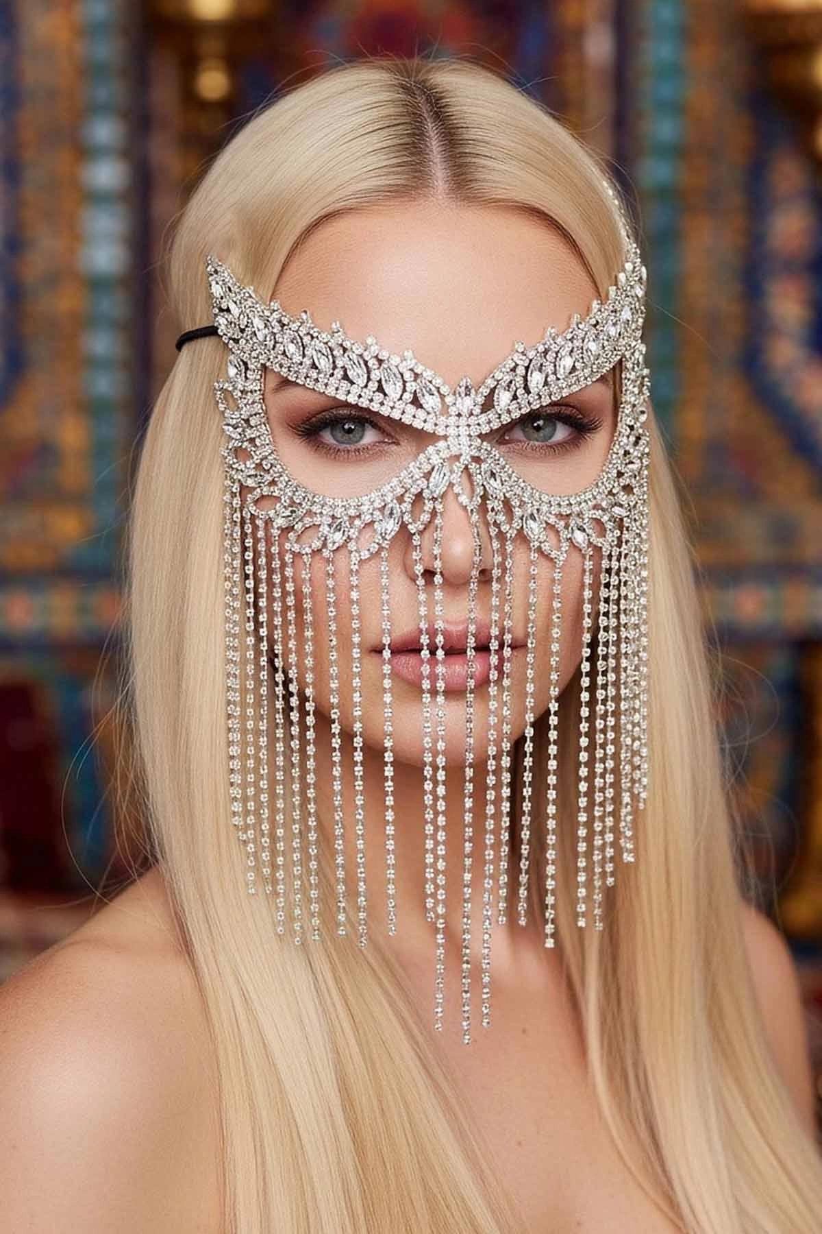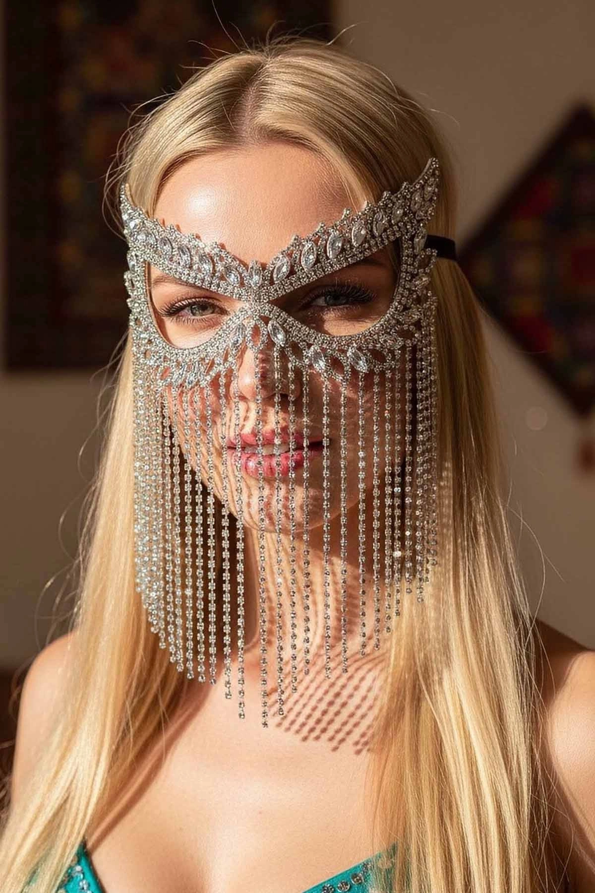 Bu taşlı yüz party maskesi, parti gecelerinde parıltınızı ve çekiciliğinizi artırmak için tasarlanmıştır. Zarif taş detayları ile süslenmiş olan bu maskenin altındaki yüzünüz, partinin en göz alıcı görüneni olacak.