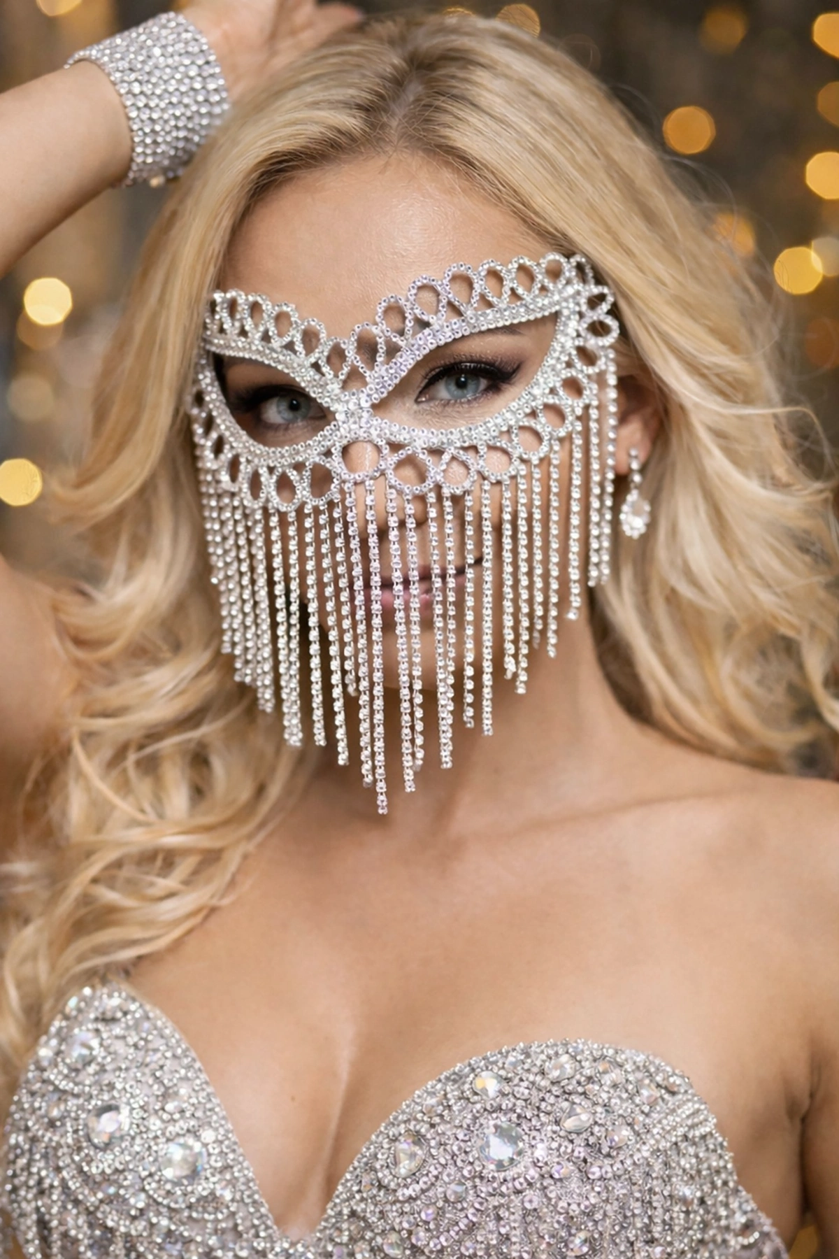 Gizem, zarafet ve ihtişamın buluştuğu bu özel dansöz maskesi, sahnede tüm bakışları üzerinize çekmek için tasarlandı. İnce işçilikle hazırlanmış altın renkli zincir detayları, yüz hatlarını zarifçe vurgularken oryantal dansın büyülü atmosferini kusursuz şekilde yansıtır.