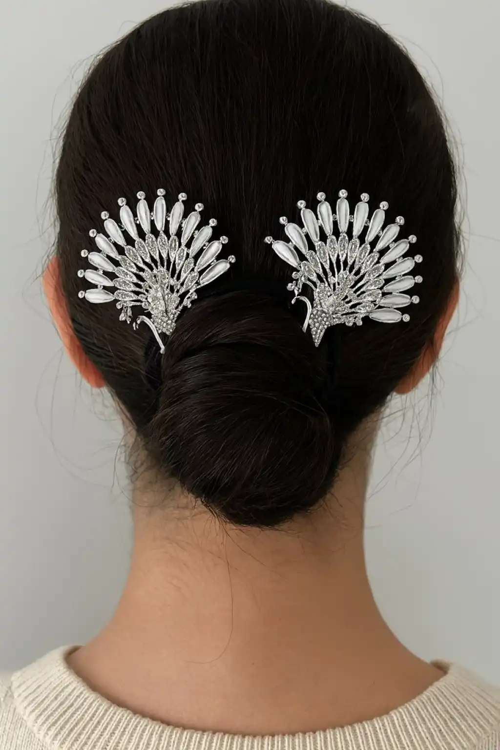Gümüş Renk Tavus Kuşu Figürlü Taş Detaylı Topuz Tokası