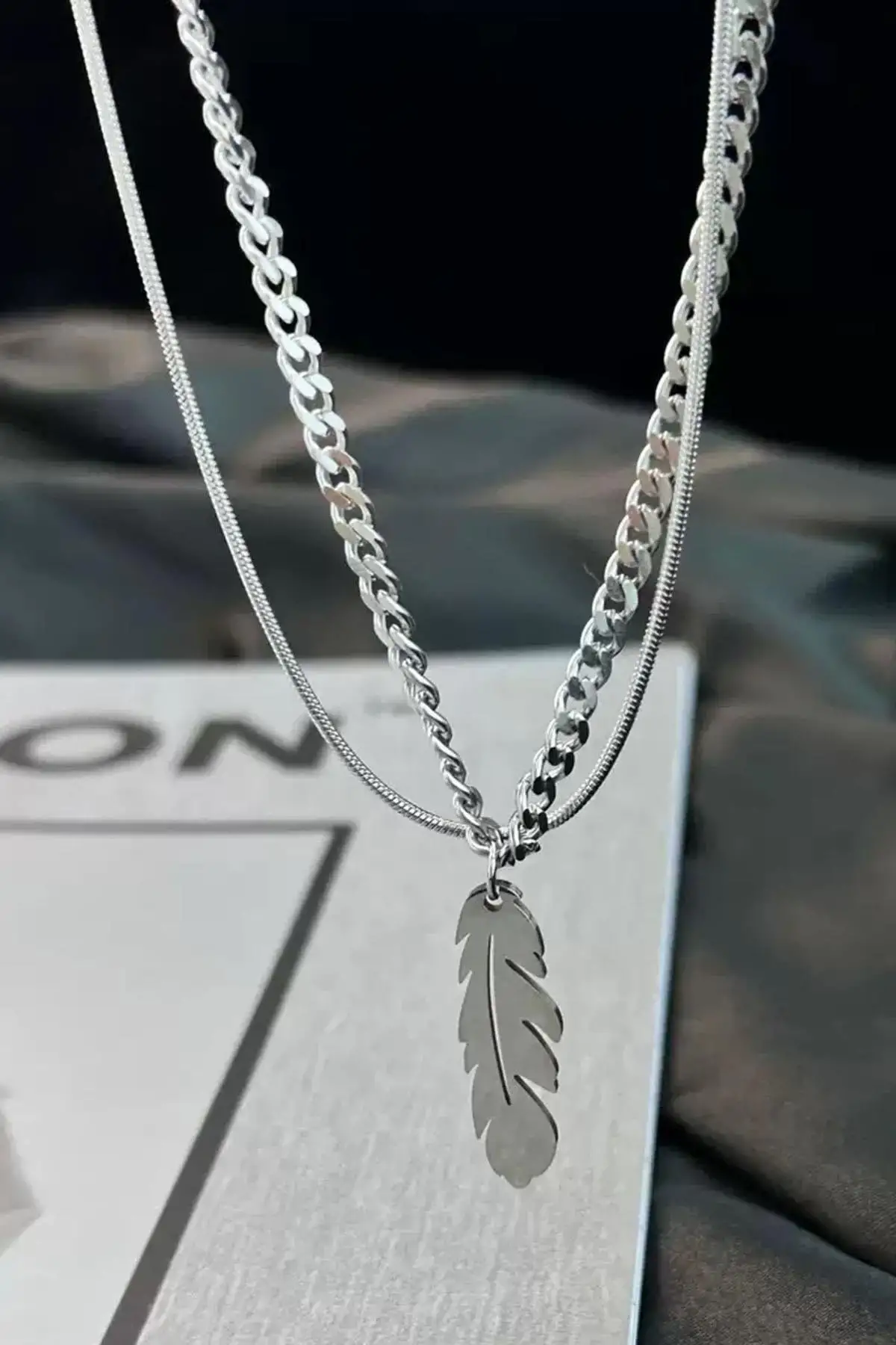 Gümüş Renk Tüy Figürlü Erkek İkili Zincir Çelik Kolye