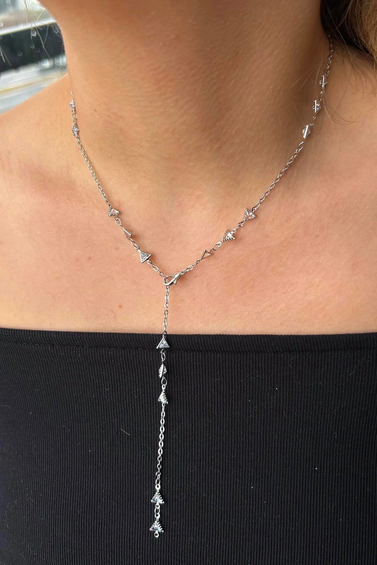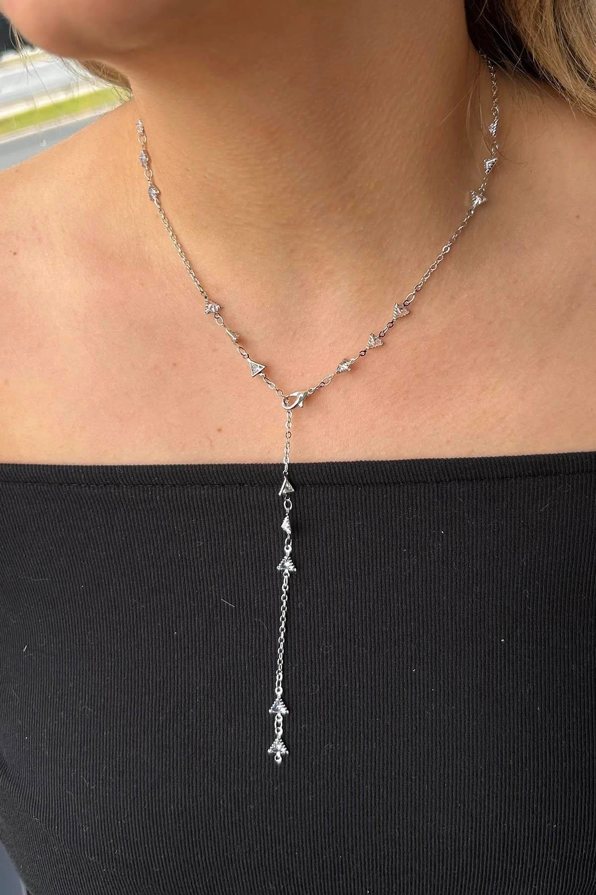 Gümüş Renk Üçgen Figürlü Taş Detaylı Çelik Y Kolye