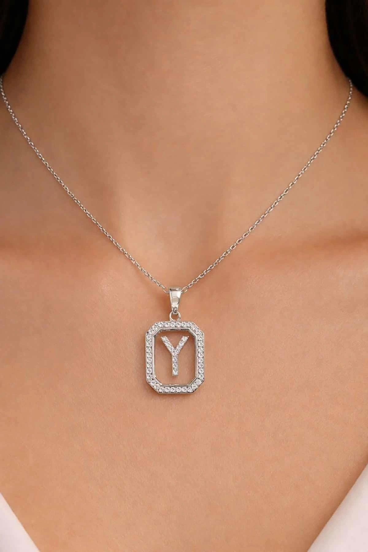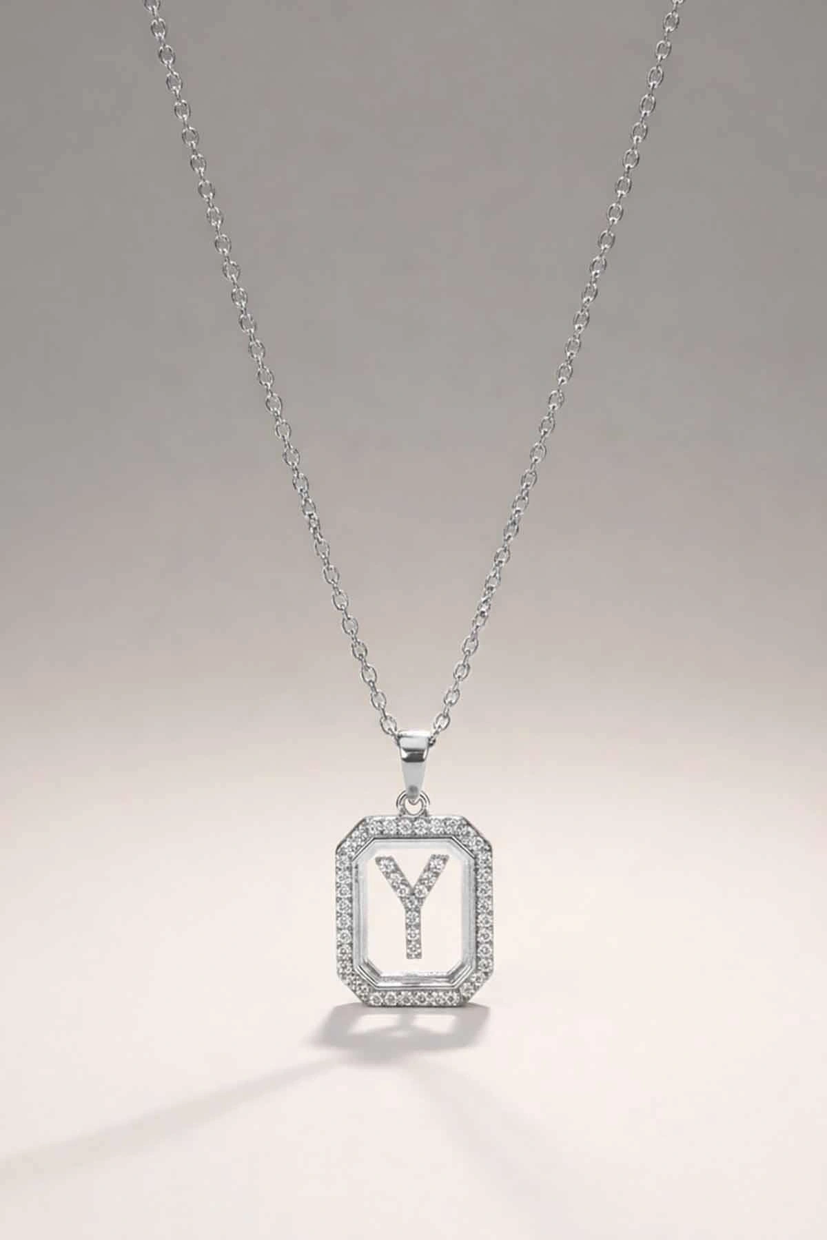 Gümüş Renk Y Harf Taş Detaylı Çelik Kolye