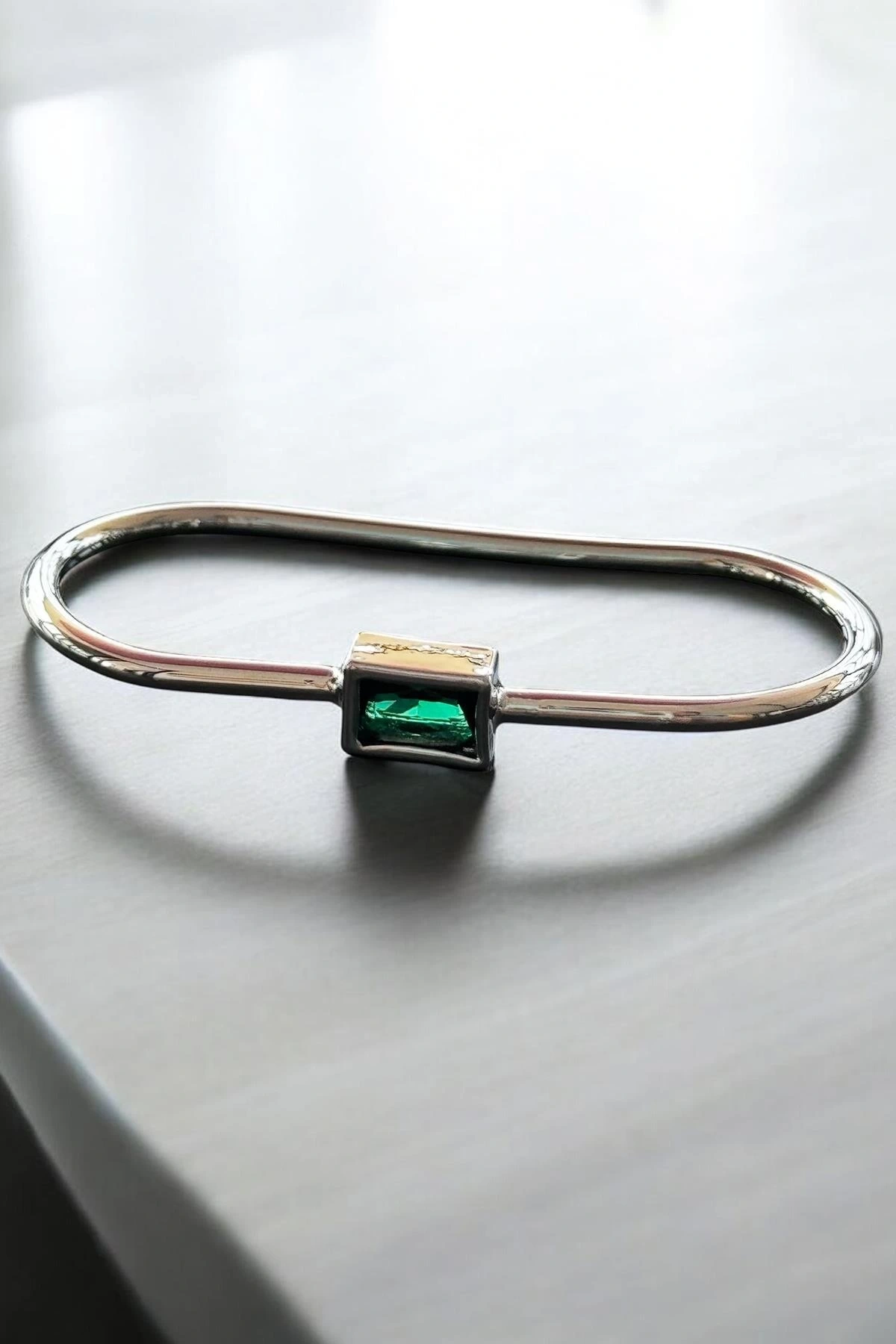 Gümüş Renk Yeşil Taş Detaylı İki Parmak Tasarım Yüzük