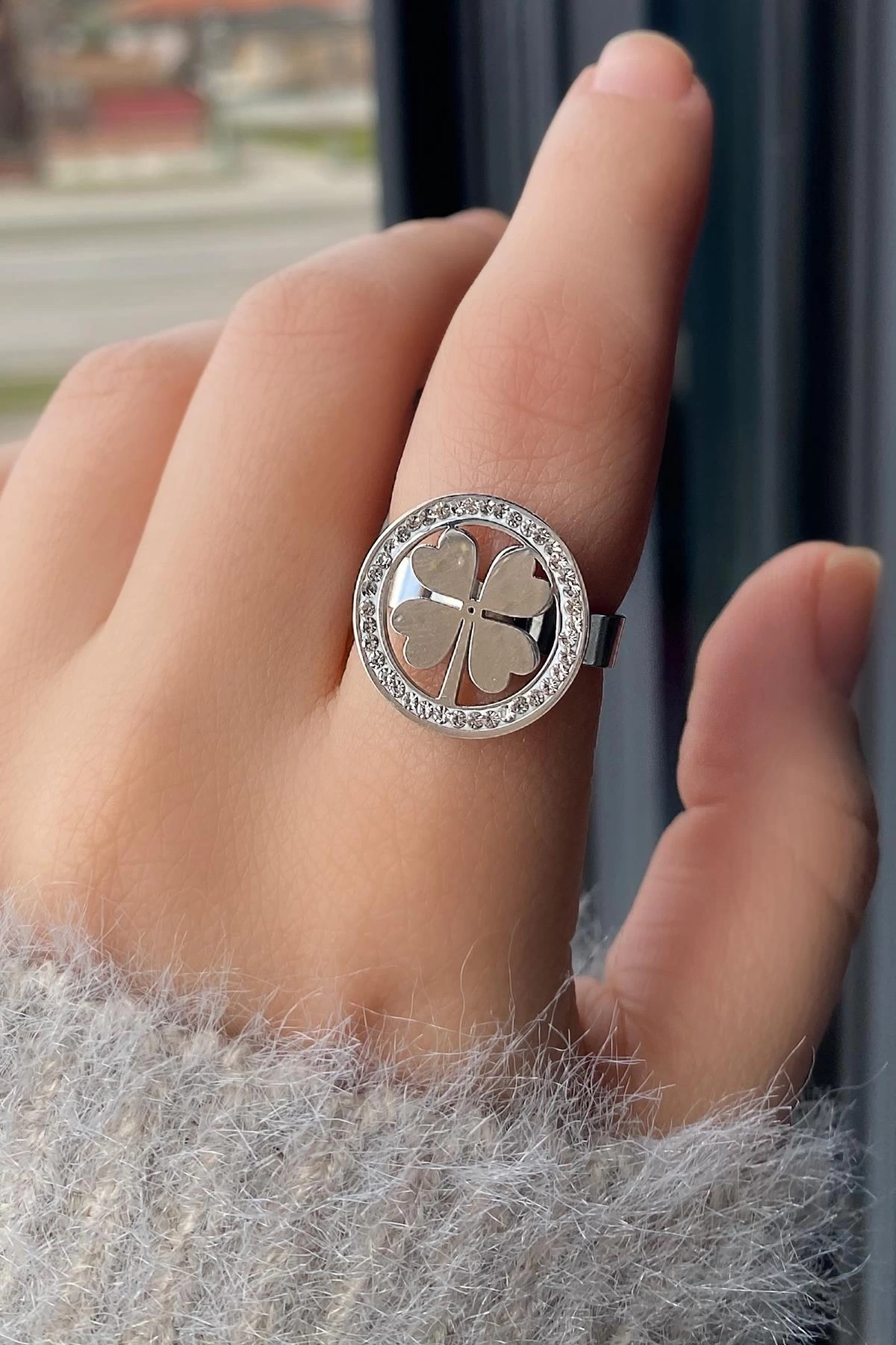 Gümüş Renk Yonca Figürlü Ayarlanabilir Çelik Yüzük