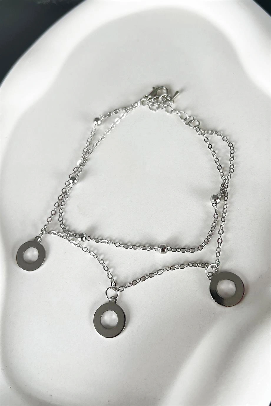 Gümüş Renk Yuvarlak Detaylı İkili Zincirli Halhal