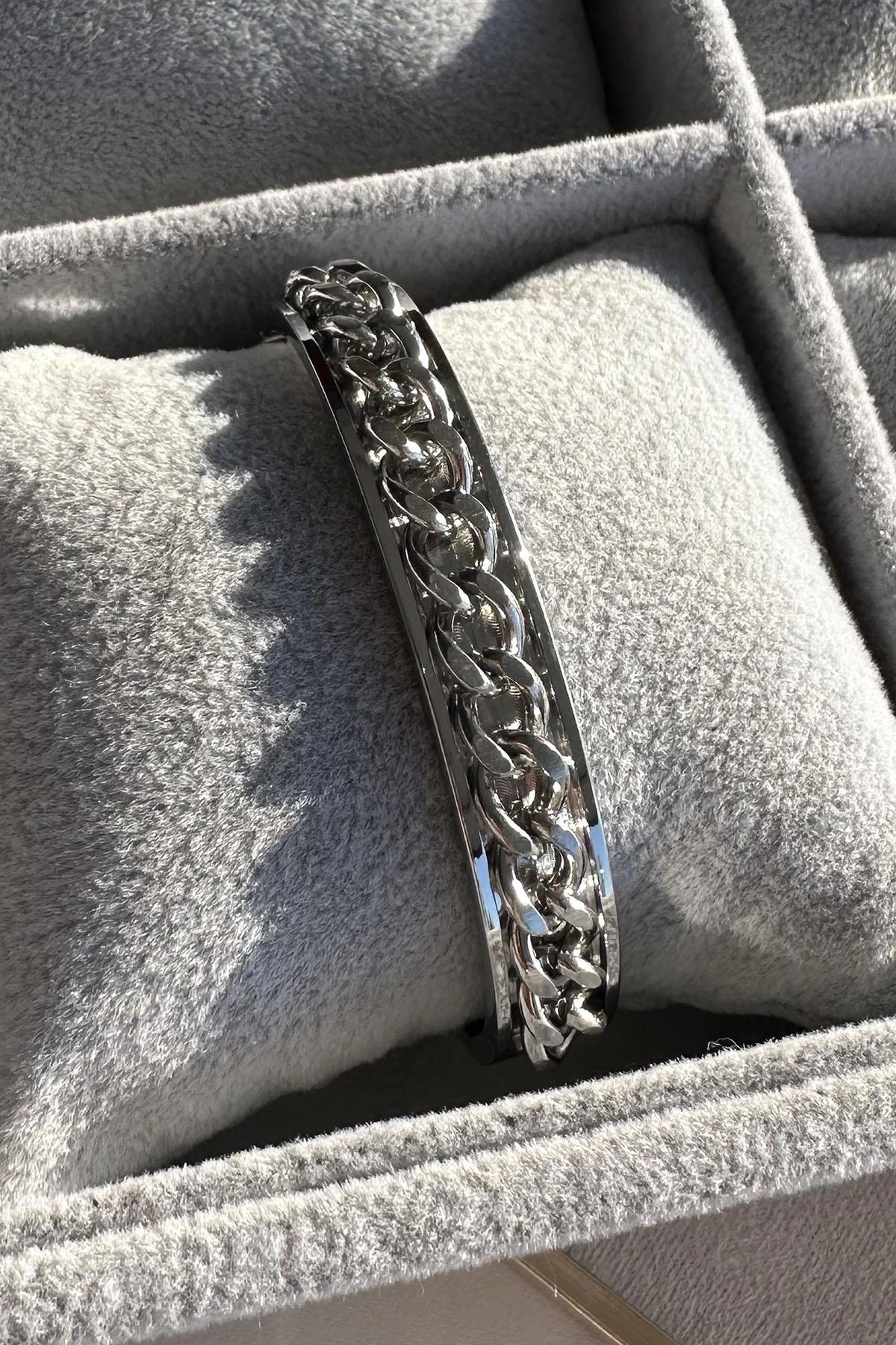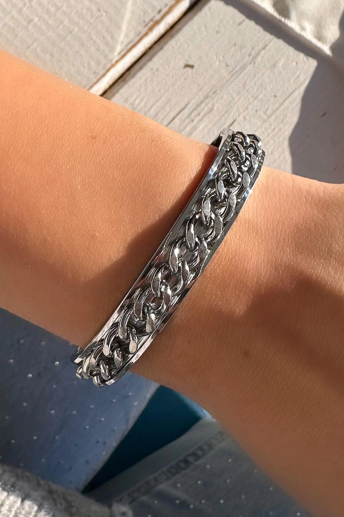 Gümüş Renk Zincir Detaylı Çelik Kelepçe Bileklik