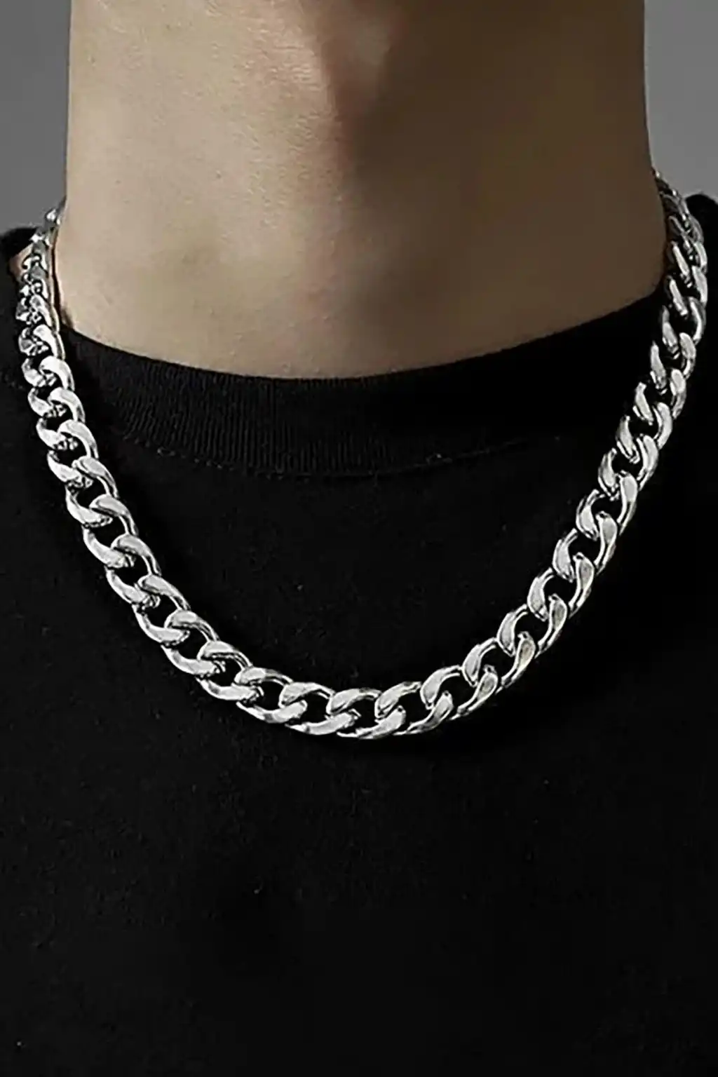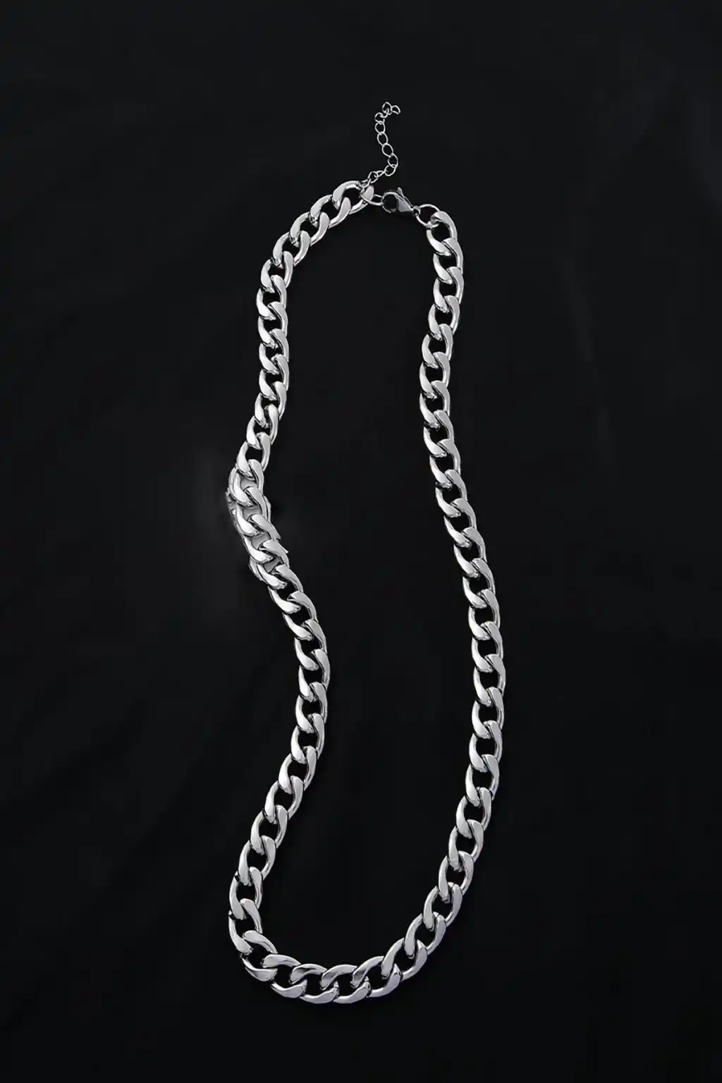 Gümüş Renk Zincir Detaylı Unisex Çelik Kolye