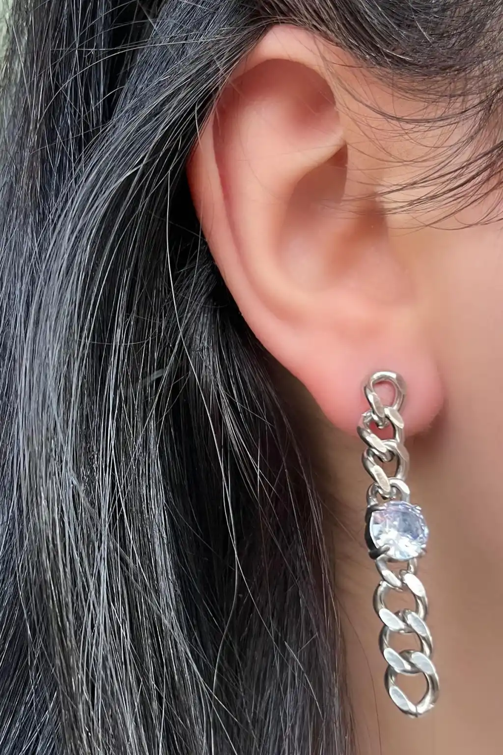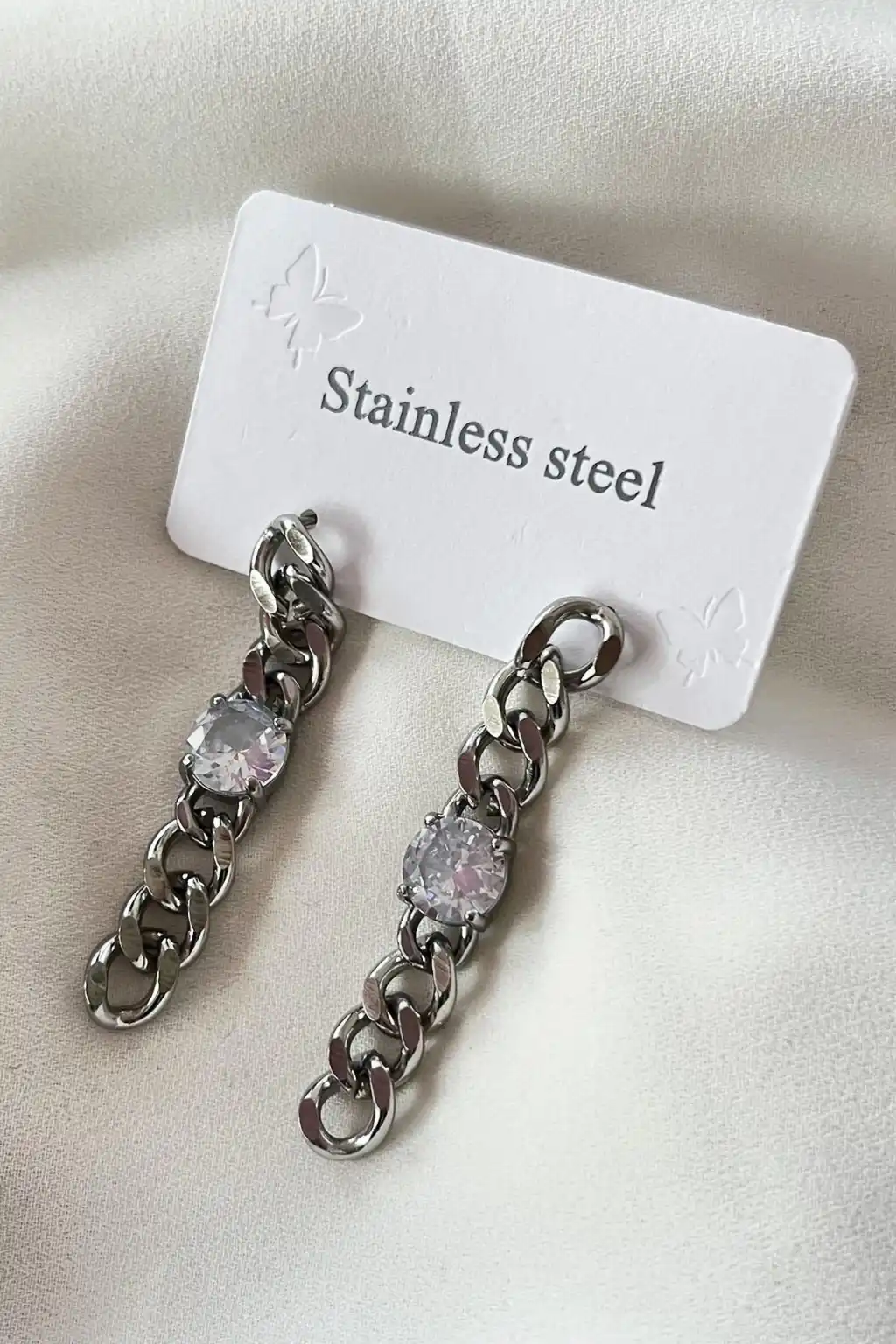 Gümüş Renk Zincir Figürlü Taş Detaylı Çelik Küpe (Çift)