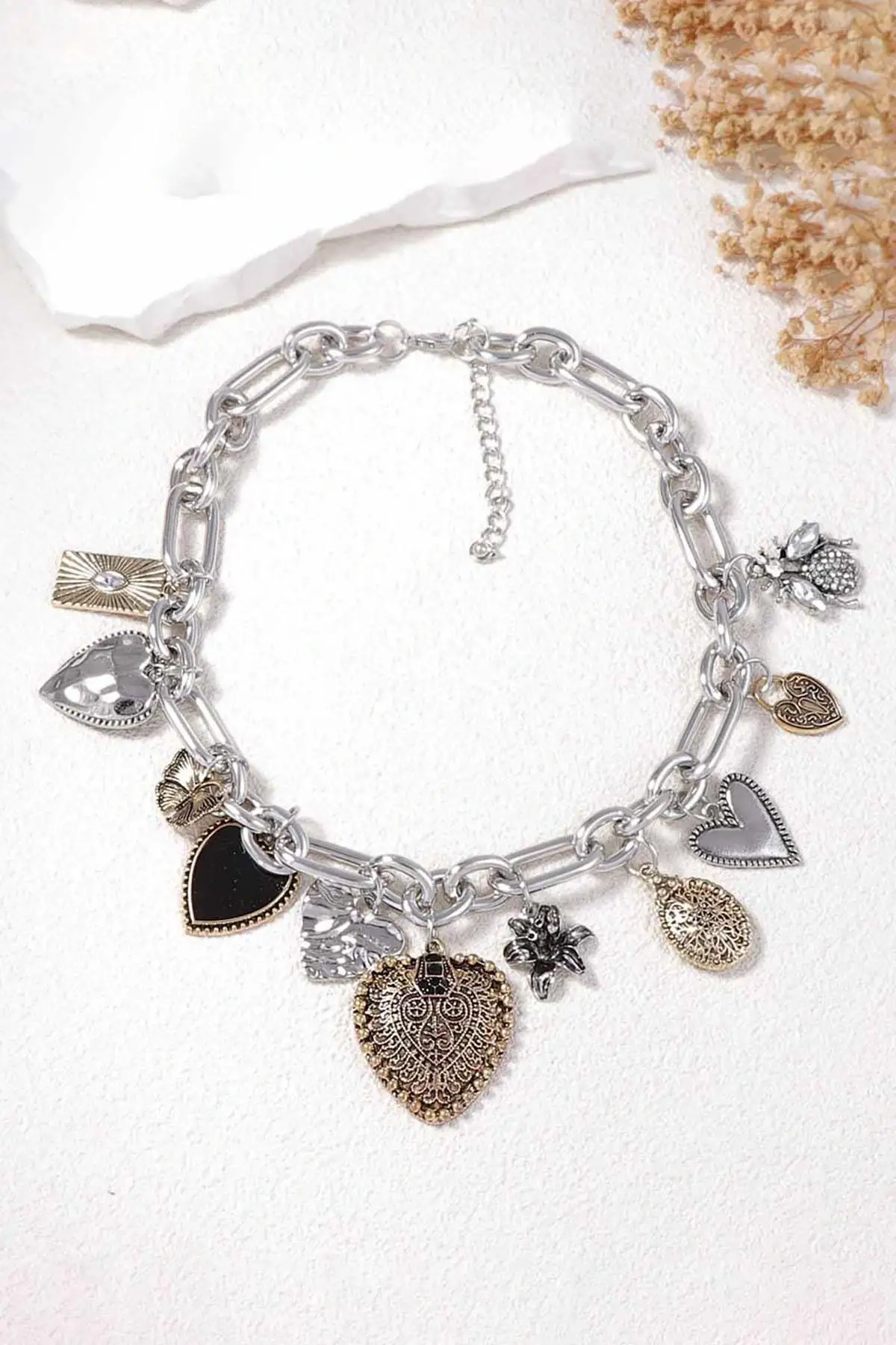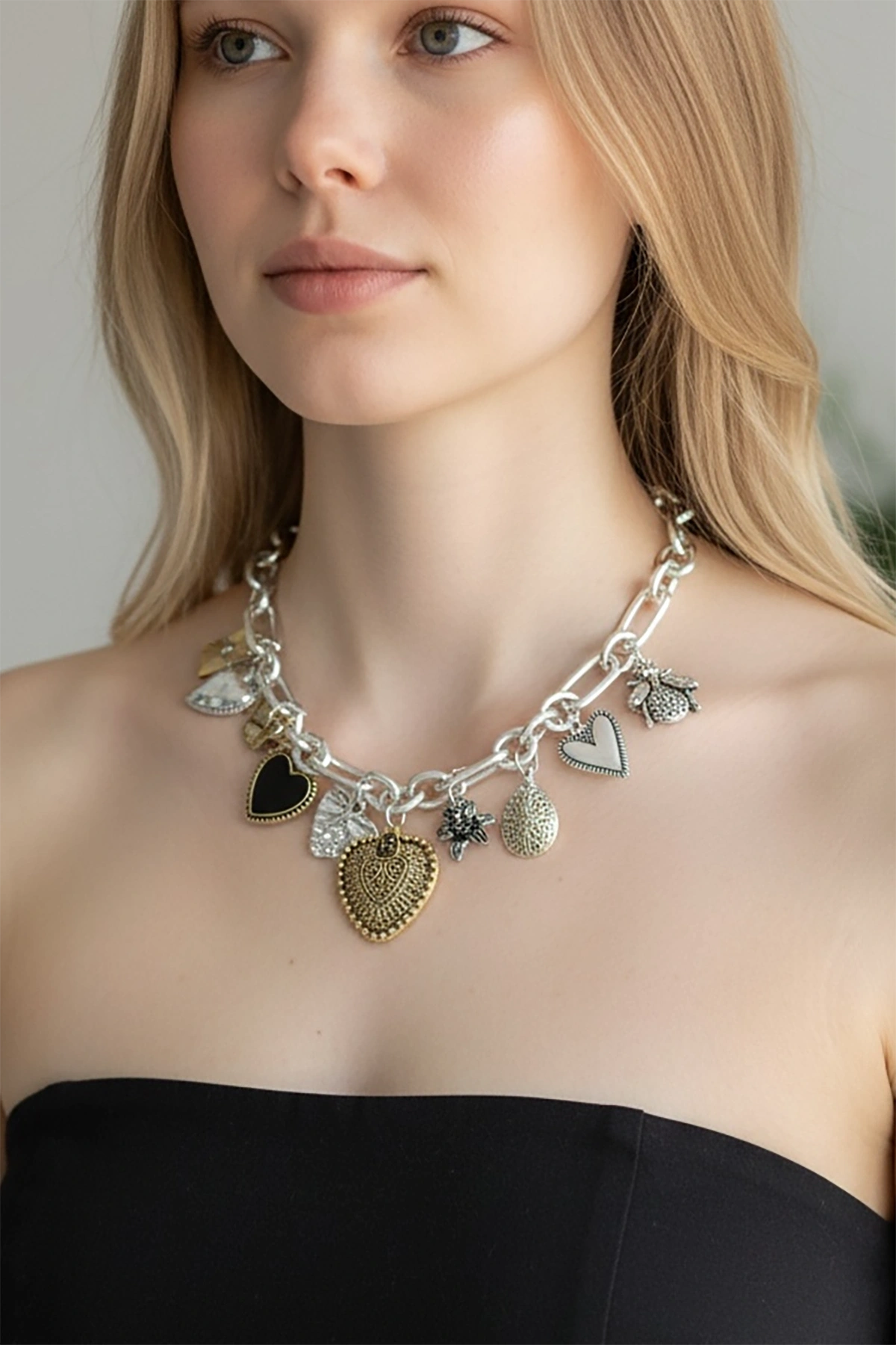 Gümüş Ve Altın Renk Charmlı Tasarım Kolye