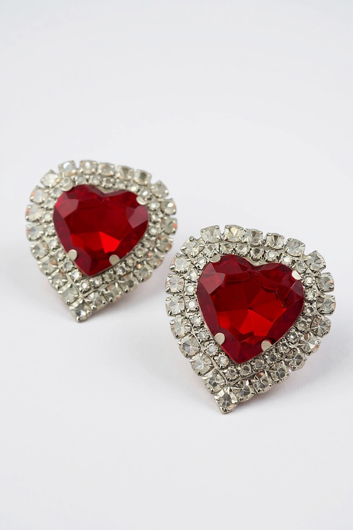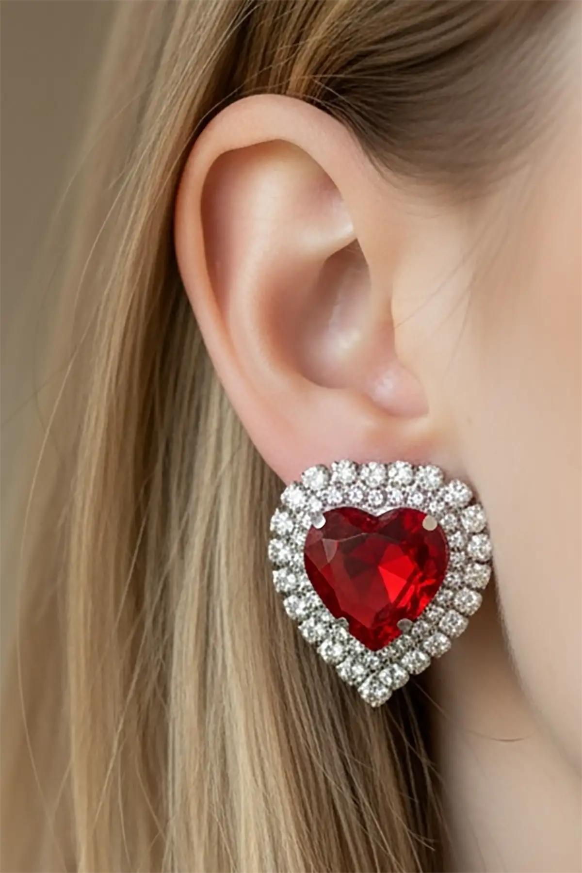 Gümüş ve Kırmızı Renk Kalp Figürlü Taşlı Abiye Küpe Kına/Gelin Küpe (Çift)