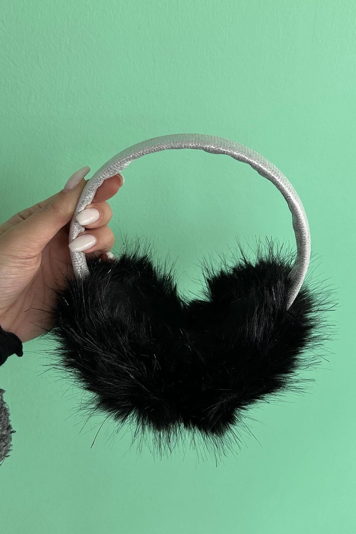 Gümüş Ve Siyah Renk Simli Peluş Kulaklık
