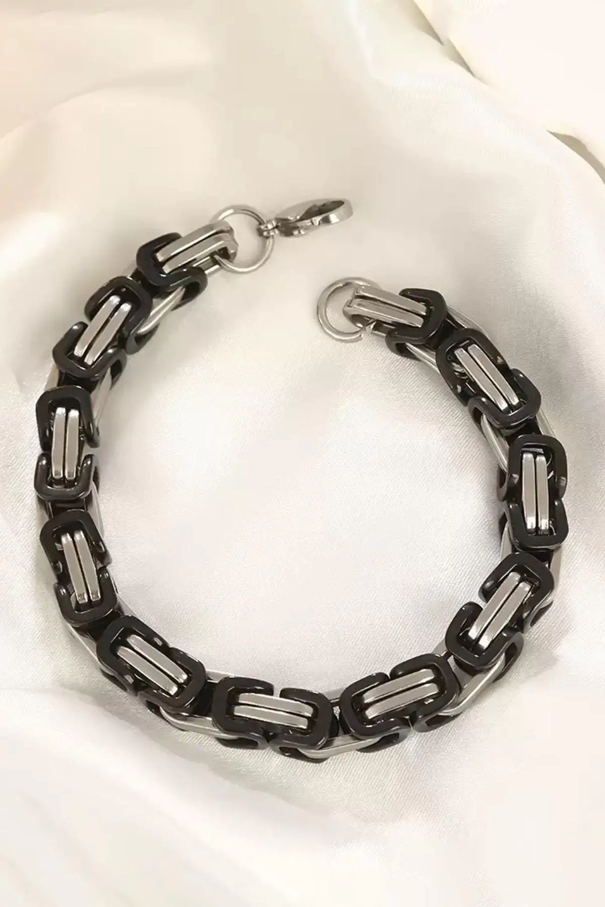 Gümüş Ve Siyah Renk Zincir Detaylı Çelik Erkek Bileklik