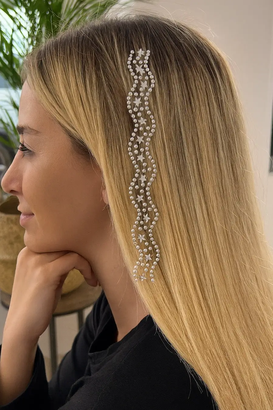 Dalga formundaki zarif tasarımı, inci ve taş detaylarıyla birleşerek her saç tipine mükemmel uyum sağlar.