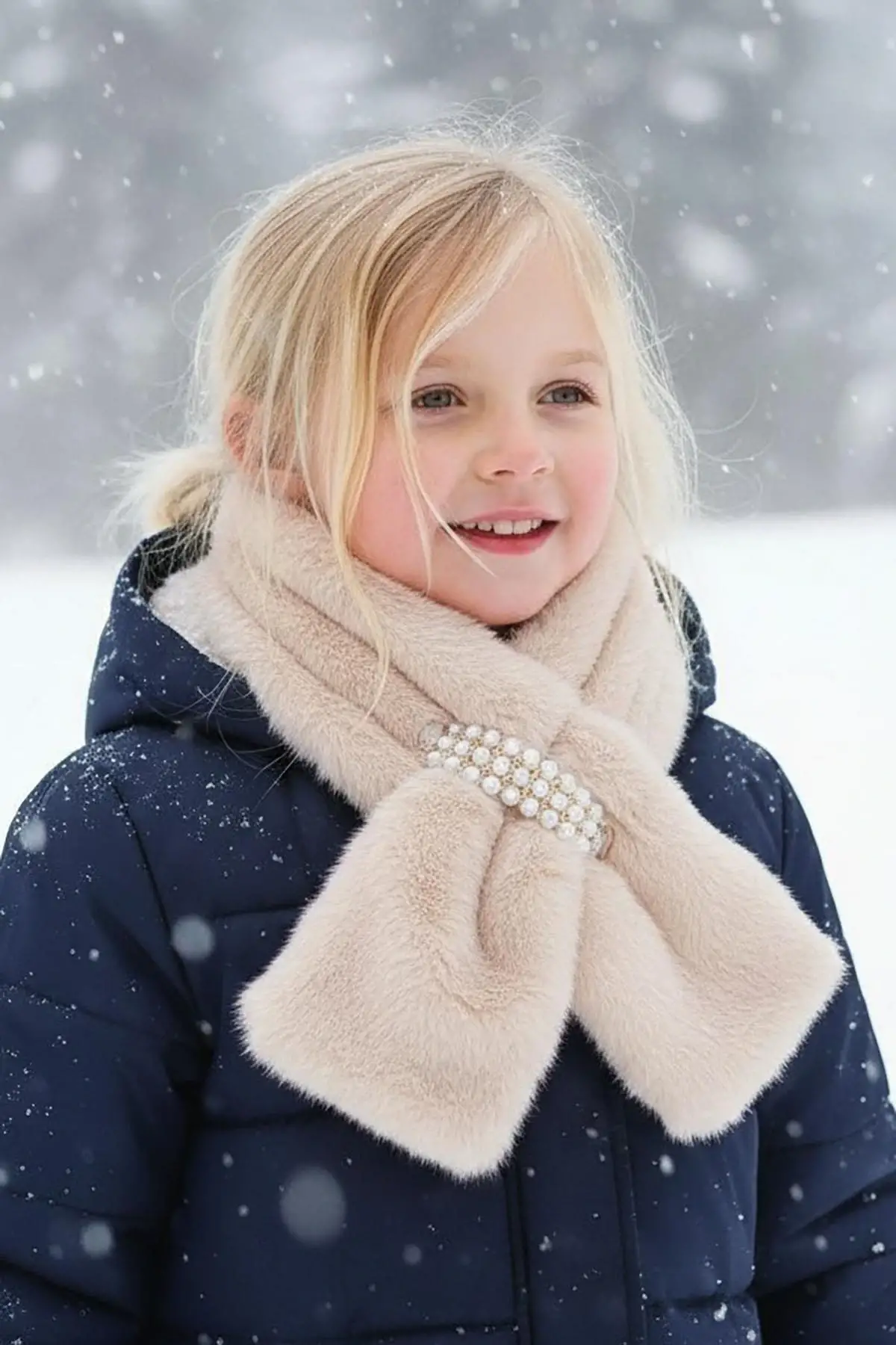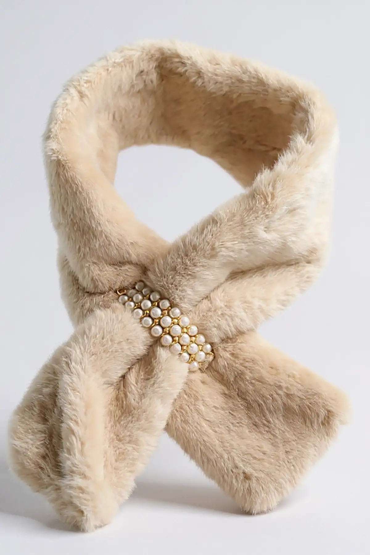 Krem Renk İnci Detaylı Çocuk Peluş Atkı