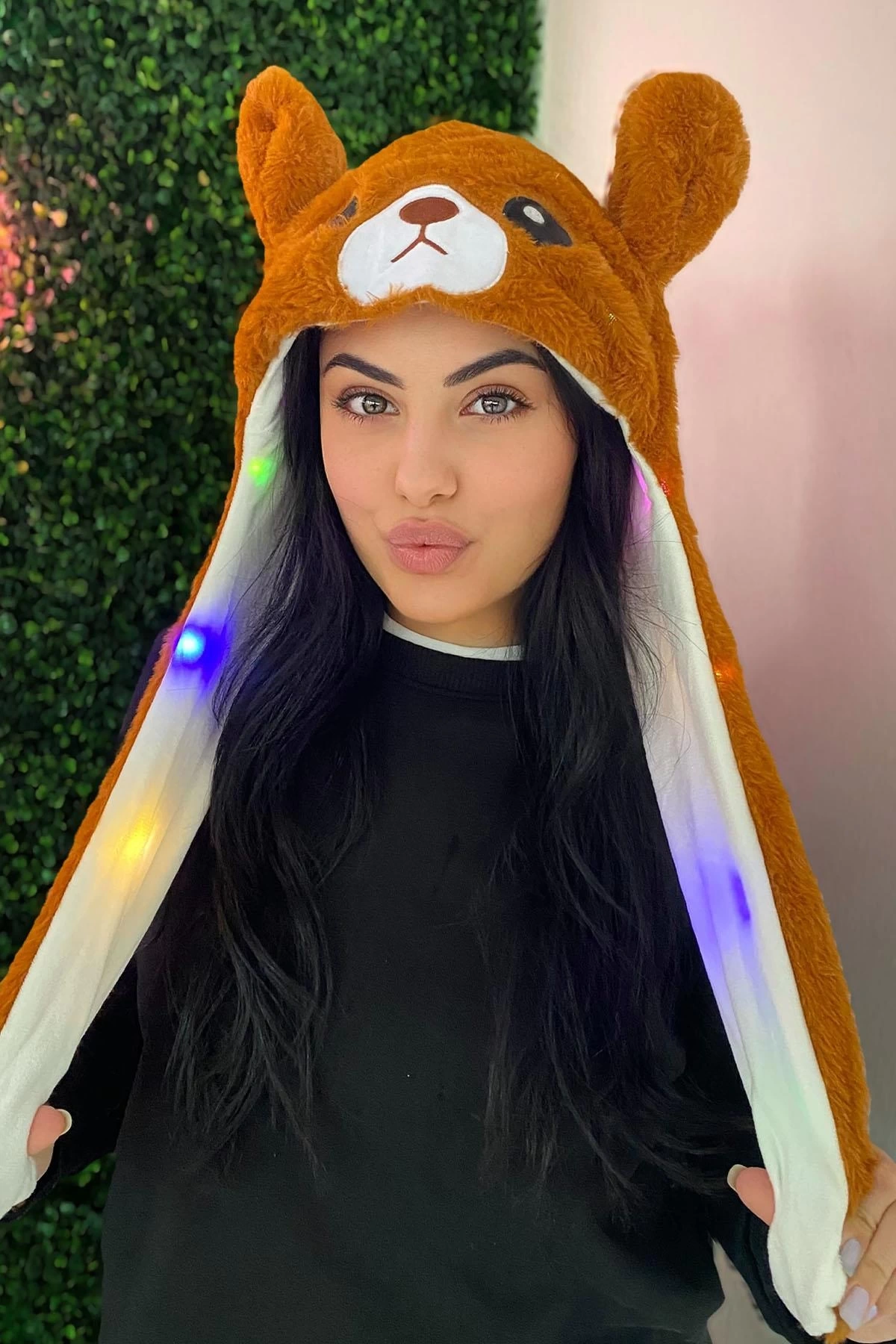Kahverengi Ayı Figürlü Işıklı Kulakları Oynayan Peluş Şapka