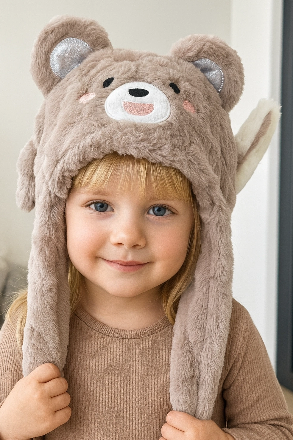 Kahverengi Ayıcık Figürlü Kulakları Oynayan Peluş Şapka
