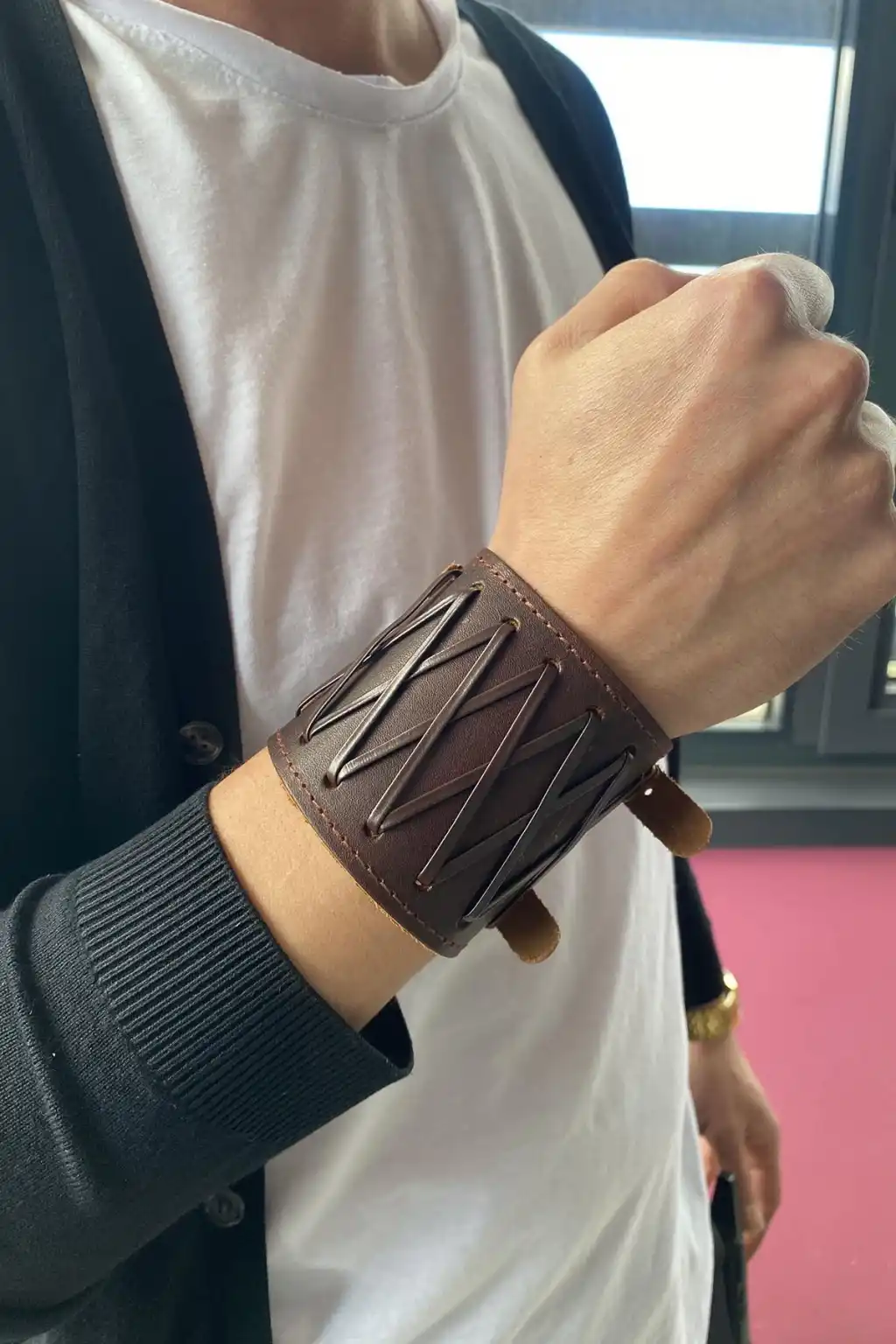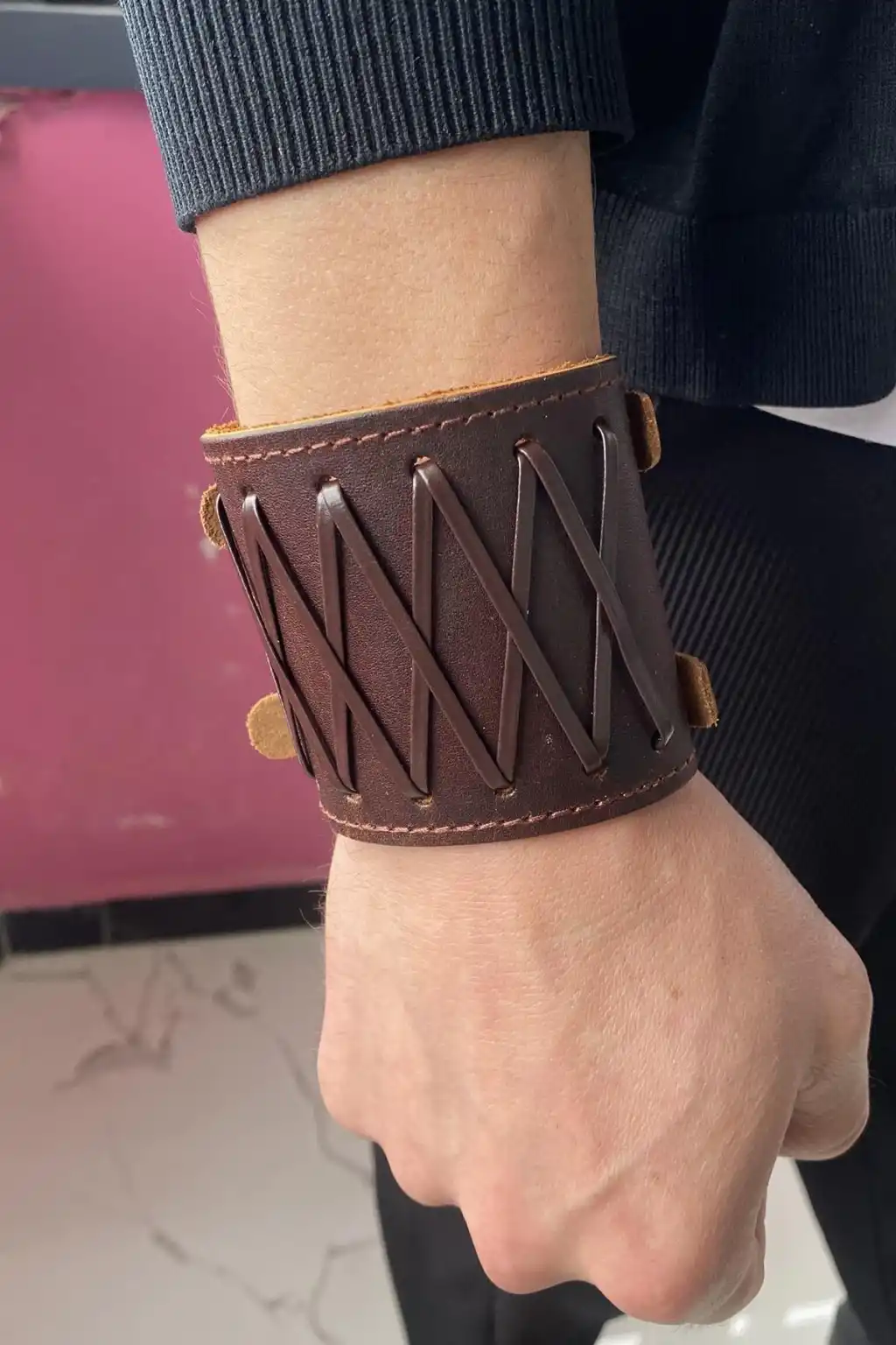 Açık Kahverengi Örgü Figürlü Deri Erkek Bileklik