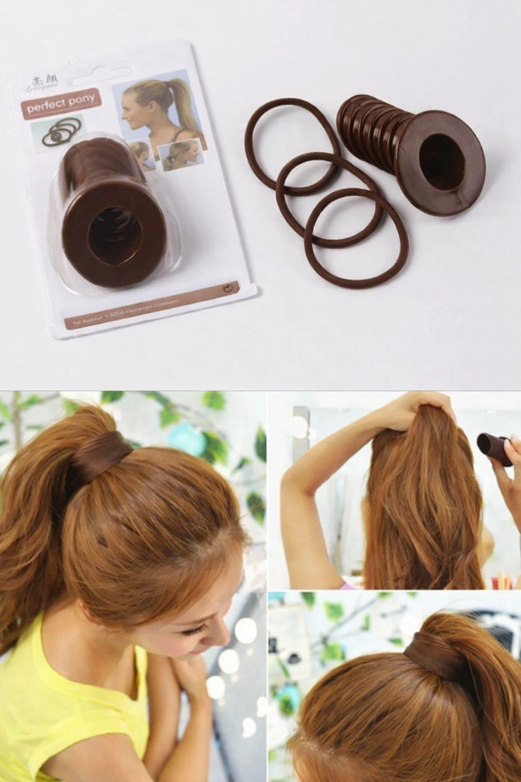 Kahverengi Hacimli At Kuyruğu Yapma Aparatı Ve Lastik Toka Set