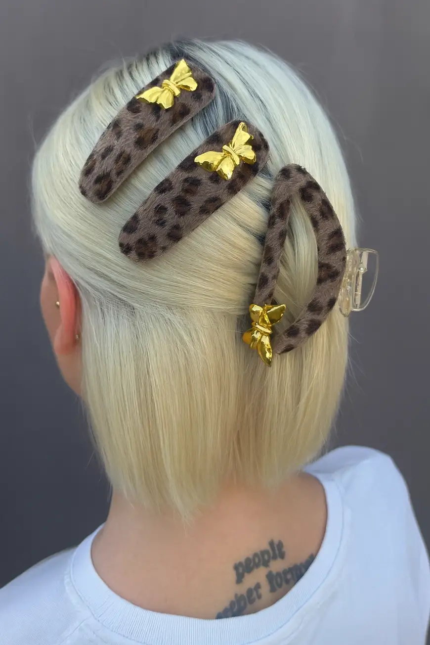 Açık Kahve Renk Kelebek Figürlü Leopar Desenli Mandal Toka Ve Yan Toka Set